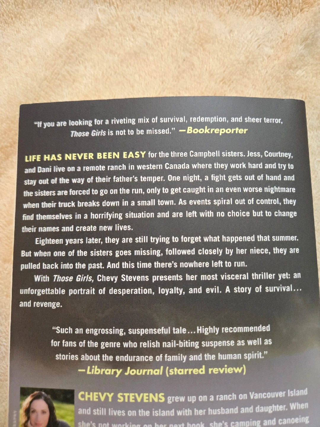 10Selling the novel "Those Girls" by Chevy Stevens! It's a thrilling story about three sisters on the run. Perfect for anyone who enjoys suspenseful reads and stories of survival and redemption