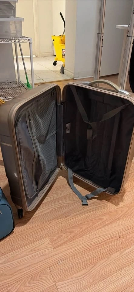 Stylish American Tourister gold carry-on suitcase. It has smooth spinner wheels and an extendable handle. Features a built-in TSA lock for security. Inside, you'll find mesh pockets and straps to keep your belongings organized. Great for your next trip!