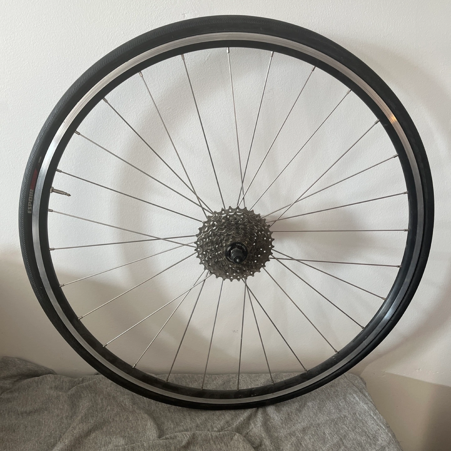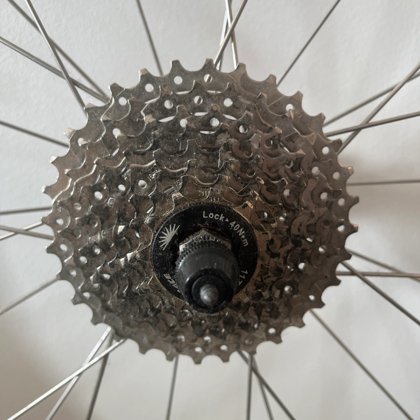 8 speed SunRace cassette and Axis hubs. Rims are in good condition, spins true and smooth.