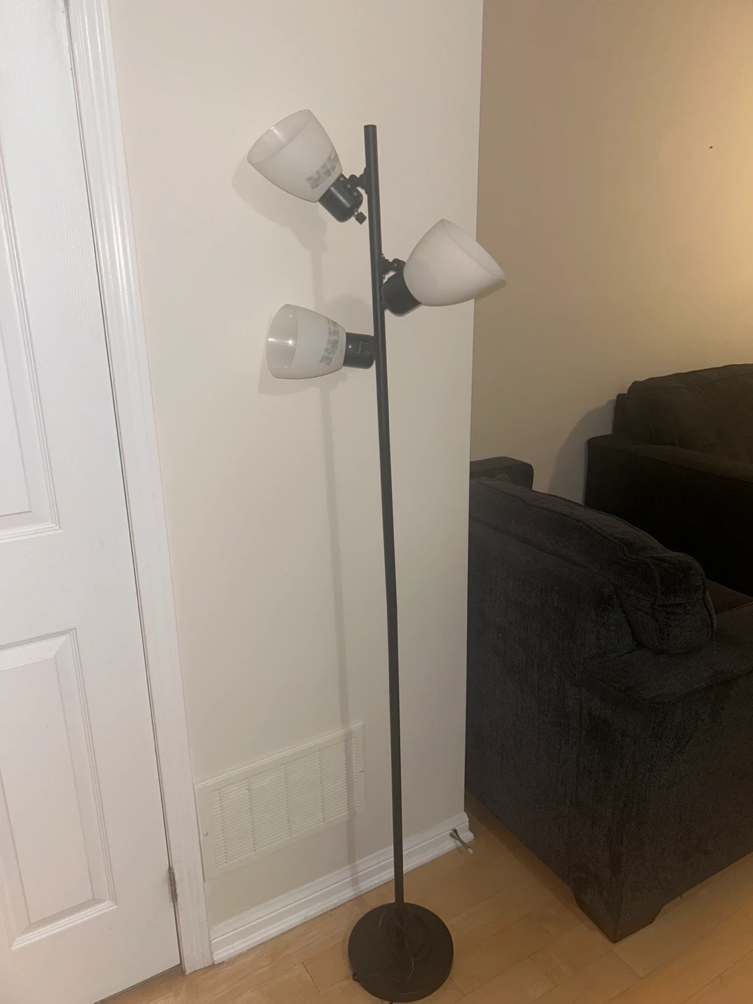 Selling a floor lamp with three adjustable lights. It's in great new shape and ready to brighten up your space! The lamp has a sleek, modern design that fits well in any room.