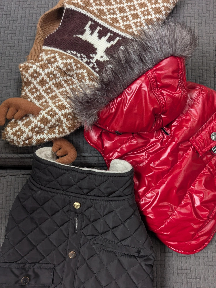 I'm selling THREE adorable doggy coats. All are for small dog breads or cats. There's a vibrant red padded vest with a faux fur hood and a stylish black quilted coat. Also a very cute sweater with reindeers. All are in good condition, washed. No visible tears, stains etc. Ready to keep your furry friend warm and fashionable! Cash only, no etransfers Location: Etobicoke. Rathburn Rd and Renforth dr. Etobicoke Olympium nearby. I cannot meet outside this area