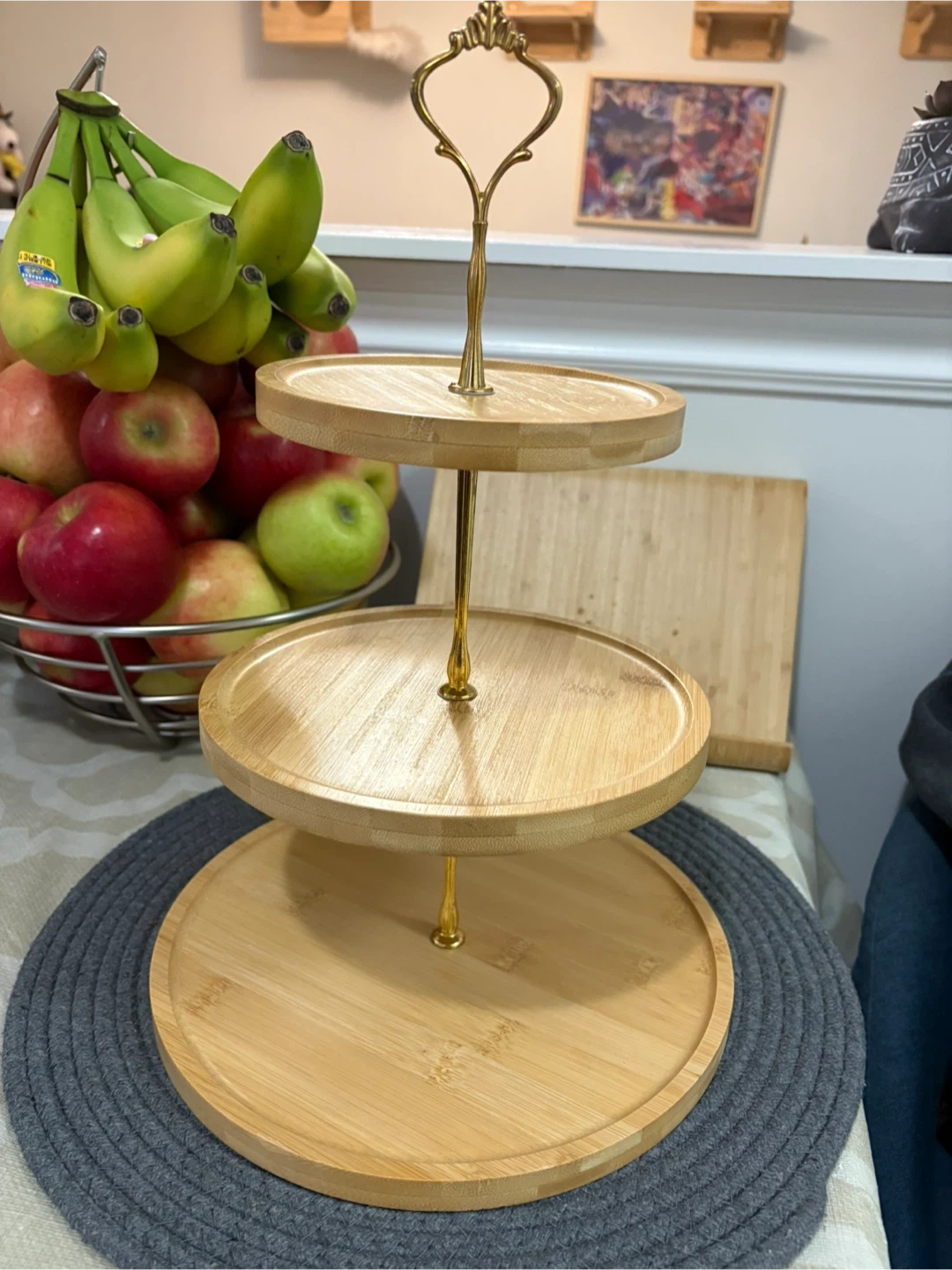 Selling a lovely three-tiered serving stand made of bamboo. It's perfect for displaying fruits, desserts, or appetizers at your next gathering. The stand has a gold-tone handle for easy carrying and adds a touch of elegance to any table setting. It's in great condition and ready to be used!
