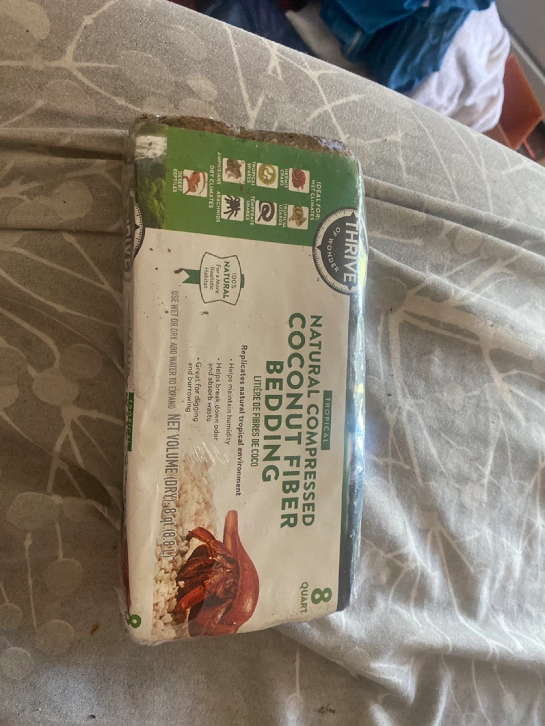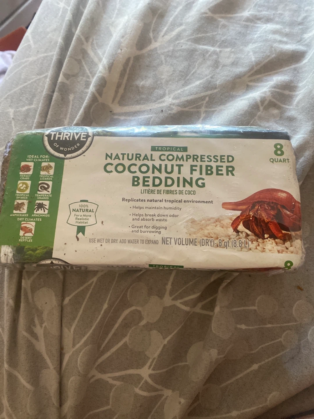Selling Thrive Tropical Compressed Coconut Fiber Bedding, 8 quart size. It replicates a natural tropical environment, helps maintain humidity, helps break down odor and absorb waste, and is great for digging and burrowing