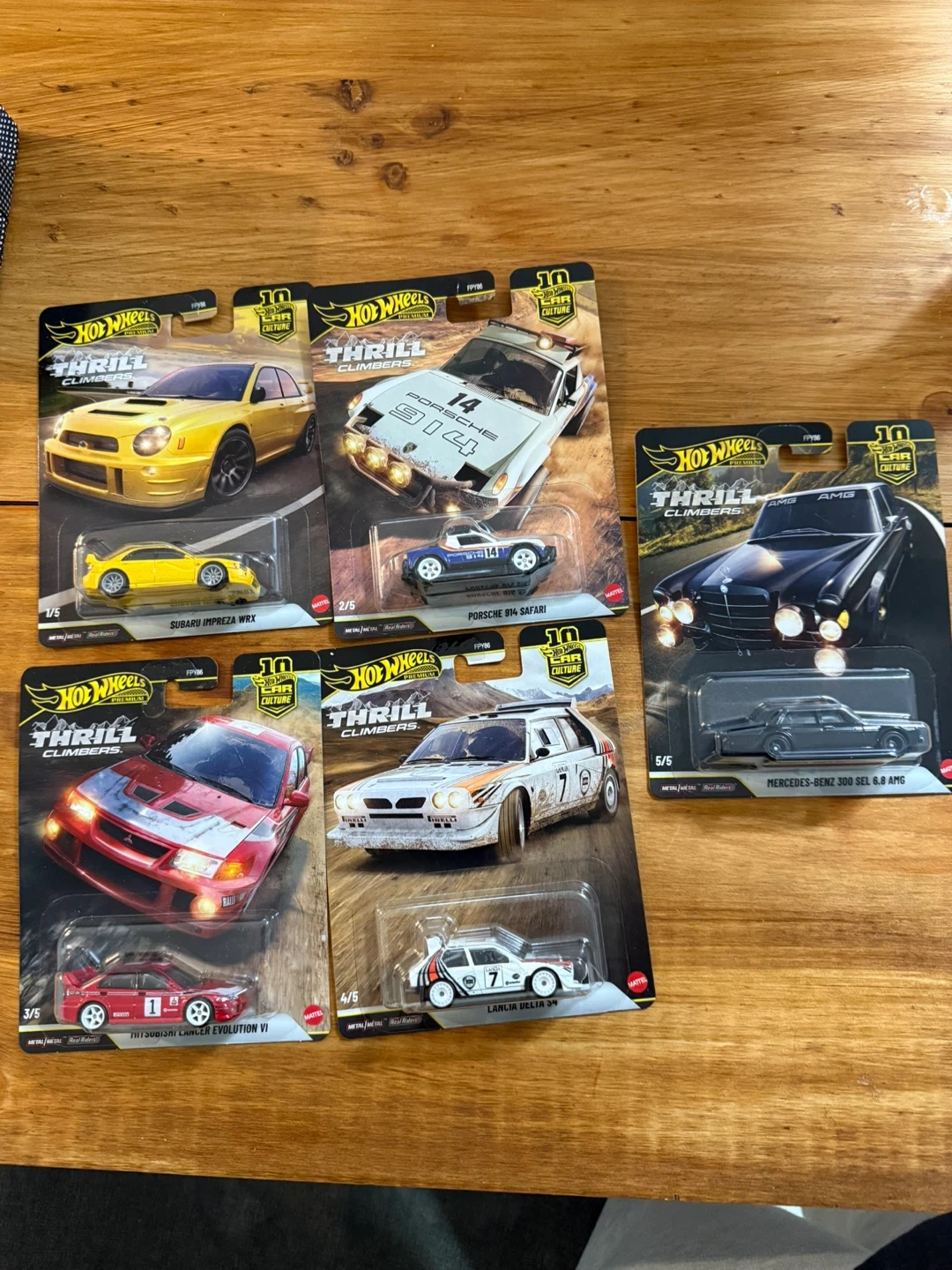 This set includes 5 Hot Wheels Premium Thrill Climbers die-cast cars. Models featured are Subaru Impreza WRX, Porsche 914 Safari, Mitsubishi Lancer Evolution VI, Lancia Delta S4, and Mercedes-Benz 300 SEL 6.8 AMG. These are 1:64 scale metal cars with Real Riders wheels.