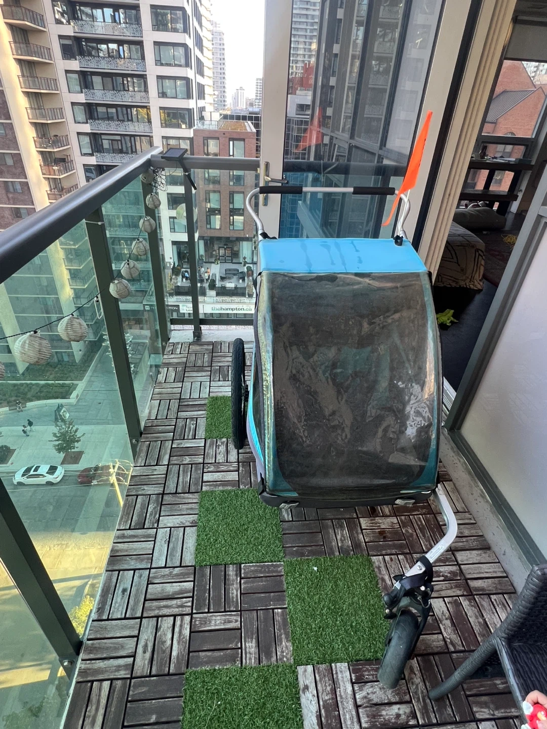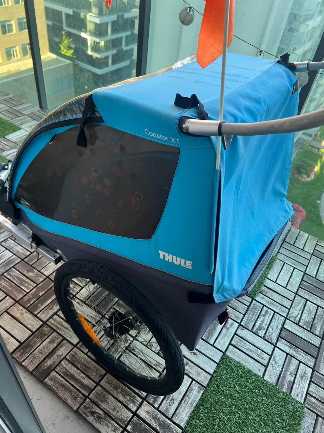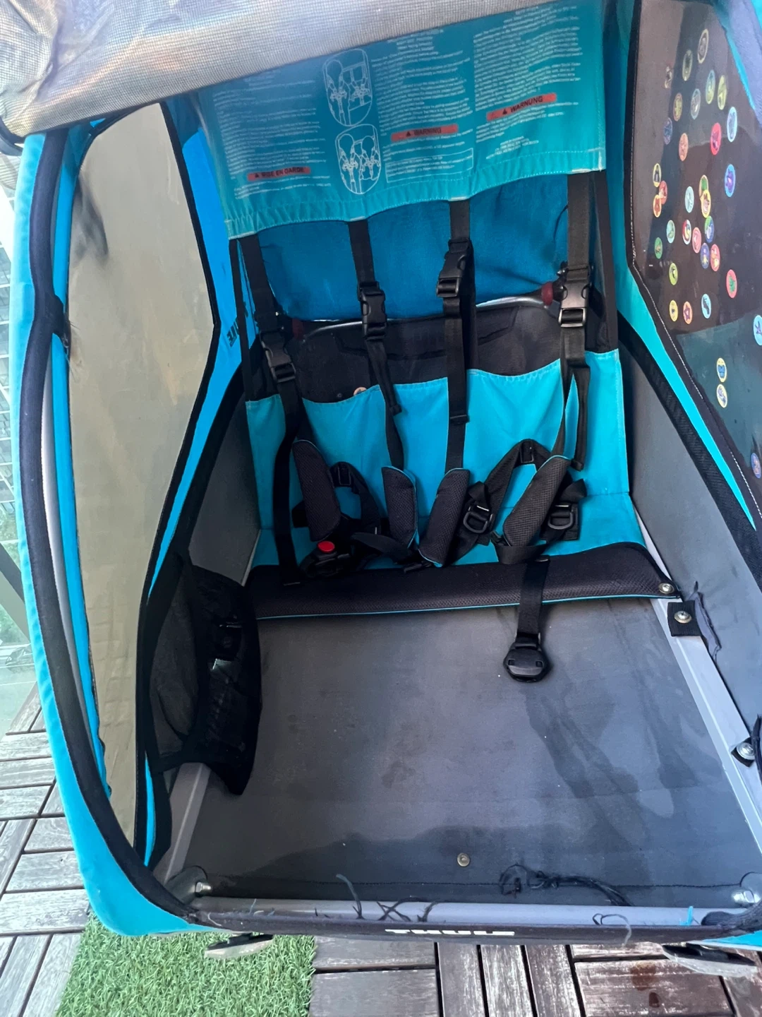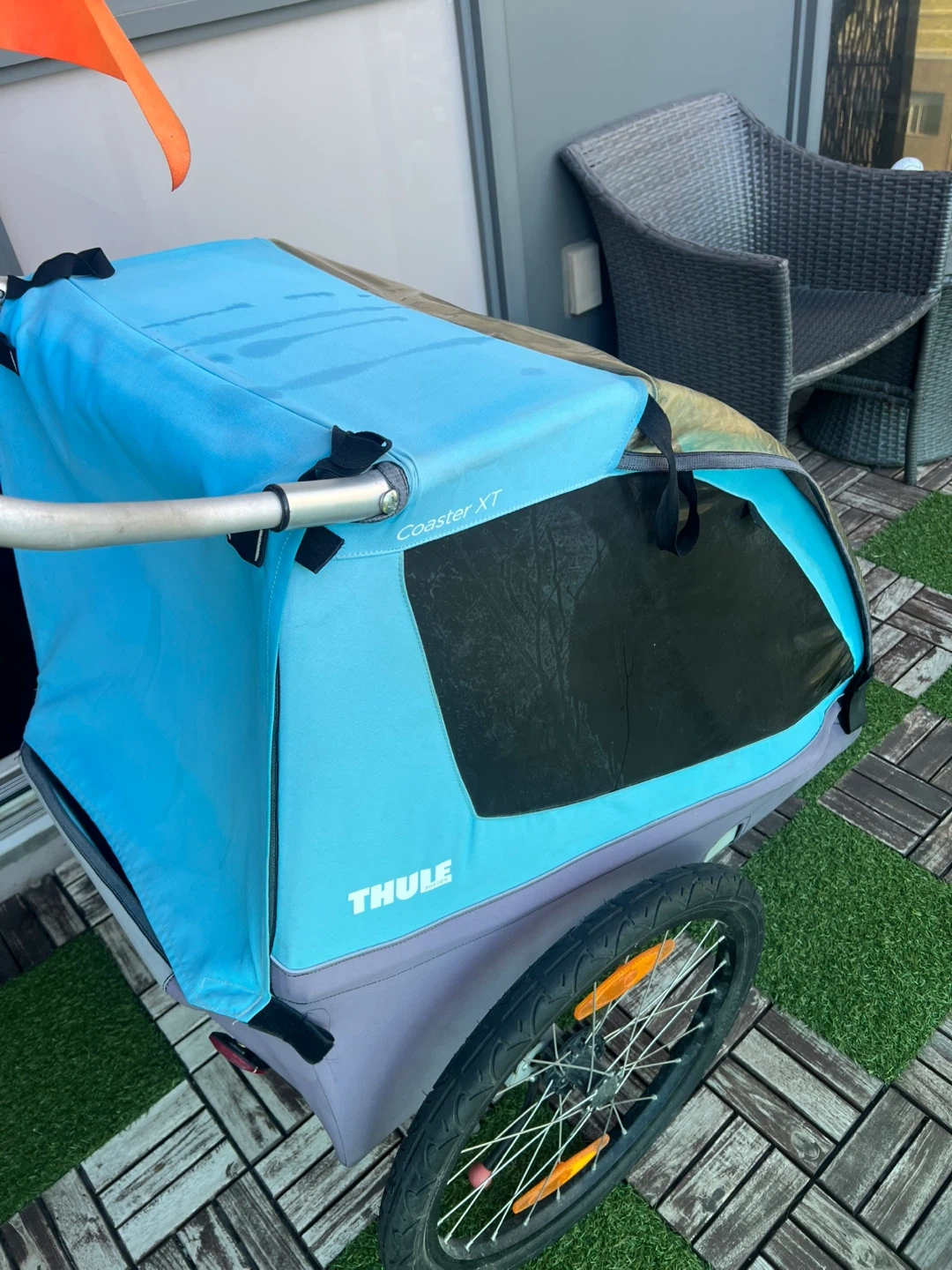 10Selling a Thule Chariot Cross 2 bike trailer in good condition. It's perfect for taking the little ones on bike rides or walks. It comes with the bike attachment and the stroller wheels. The trailer is blue and grey and has a mesh cover to keep the bugs out. It also has an orange Thule safety flag.