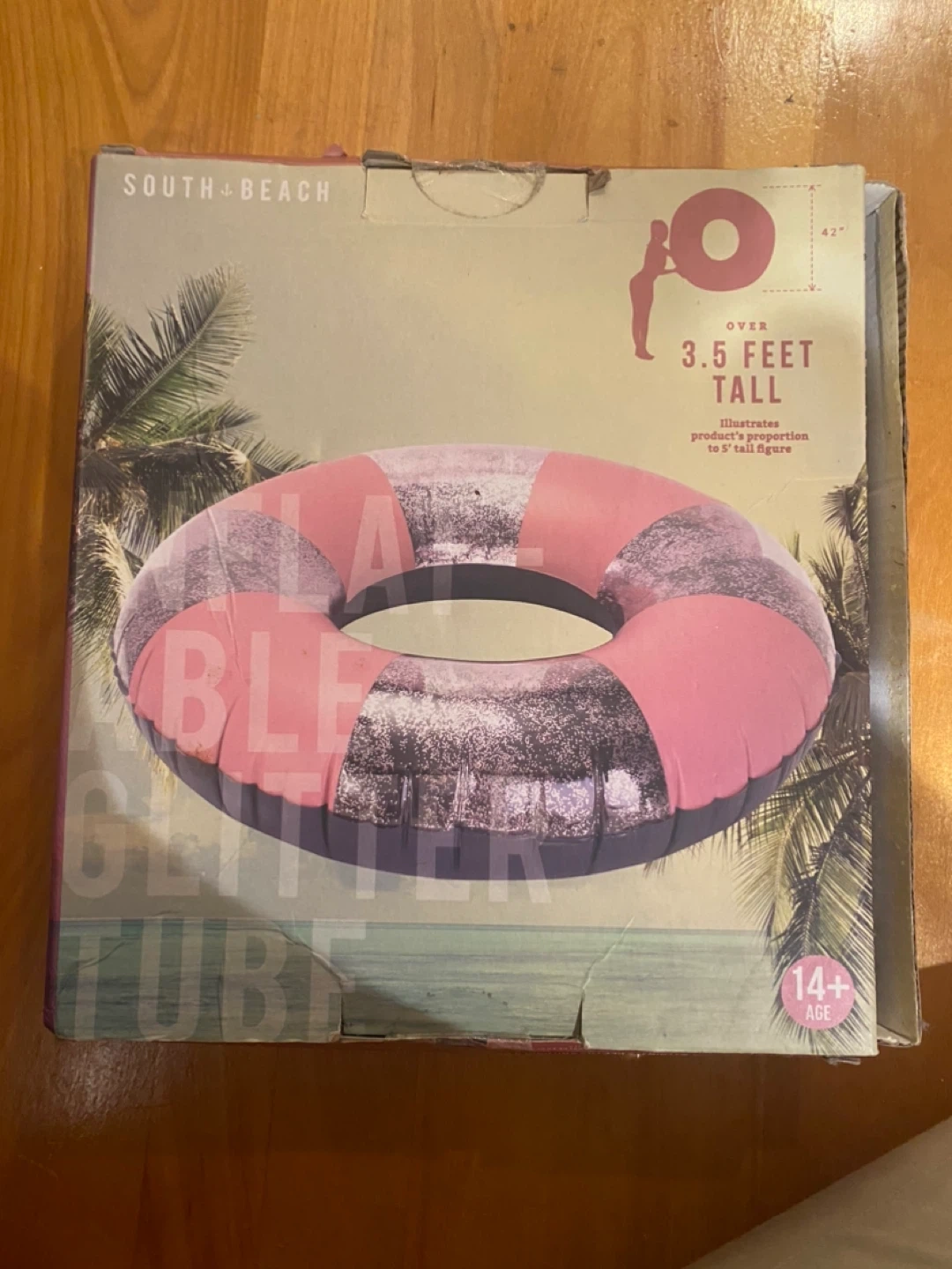 This is a new South Beach inflatable glitter tube, measuring 42" x 42". It's suitable for ages 14 and up. A fun addition for pool or beach days!