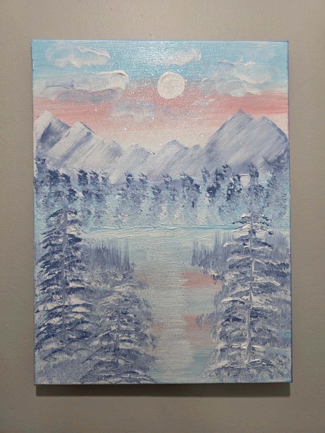 A beautiful acrylic painting on canvas depicting a serene winter scene with snow-covered mountains and pine trees. It features a tranquil lake reflecting the soft hues of the sky and a glowing moon. This artwork would add a touch of cozy ambiance to any room!
