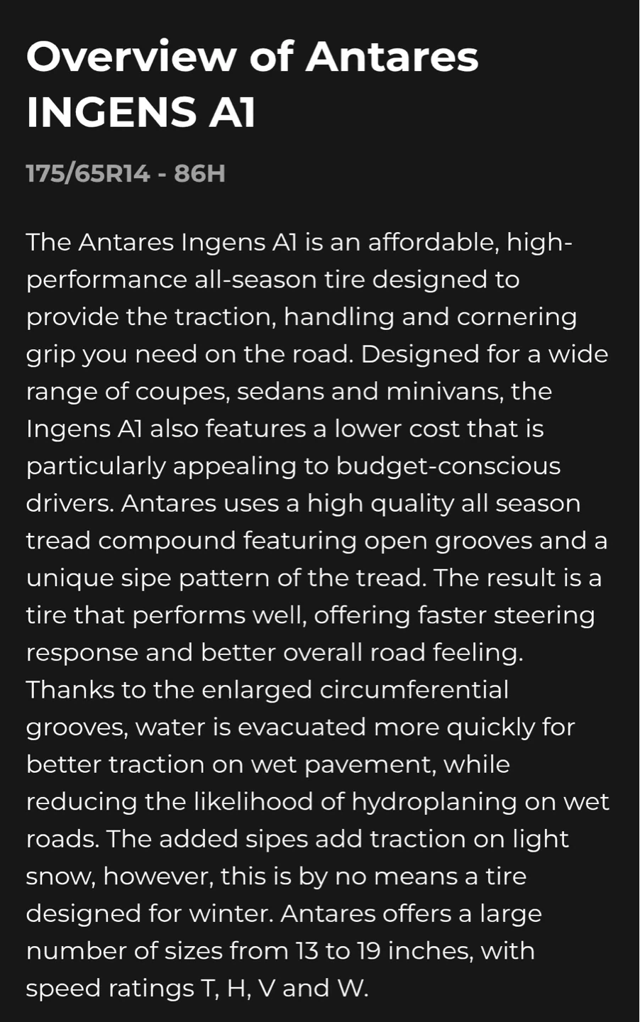 4 Antares Ingens A1 All Season Tires for Sale. **175/65/R14** Load/ Speed Rating: 86H. Great Condition. (7/32") 70% Tread Remaining. Dot # 5123. No Rips, Repairs or Cracks. Stored in a Heated Garage. Price is $180 FIRM/ Non-Negotiable for all 4 Tires. If Interested Please Message Me. Thanks.