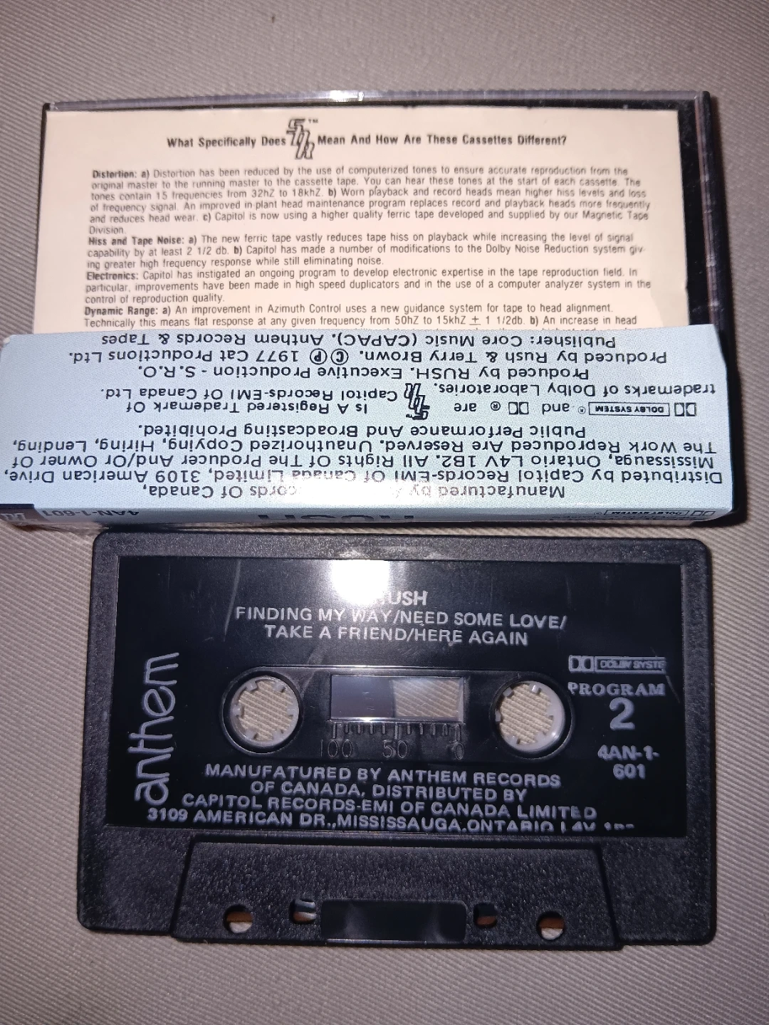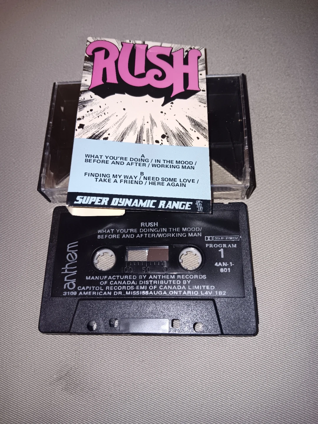 Rush "2112" album cassette tape. Features "Finding My Way / Some Love" and "Take a Friend / Here Again" on side B. "What You're Doin' / In The Mood / Before And After / Working Man" on side A. Dolby System. Super Dynamic Range.