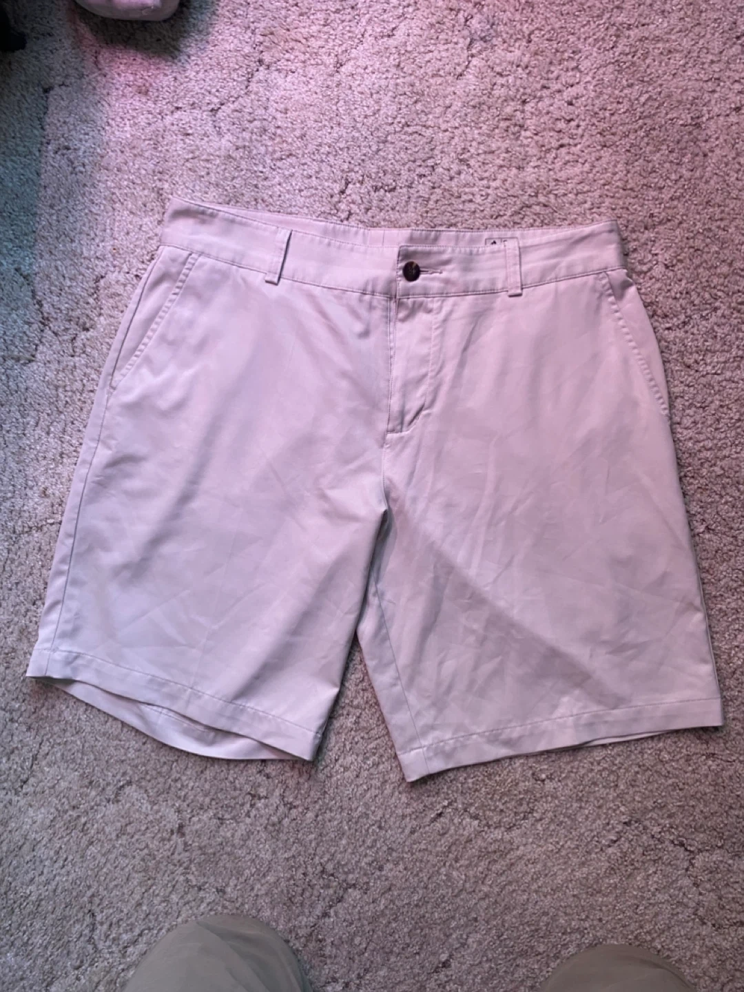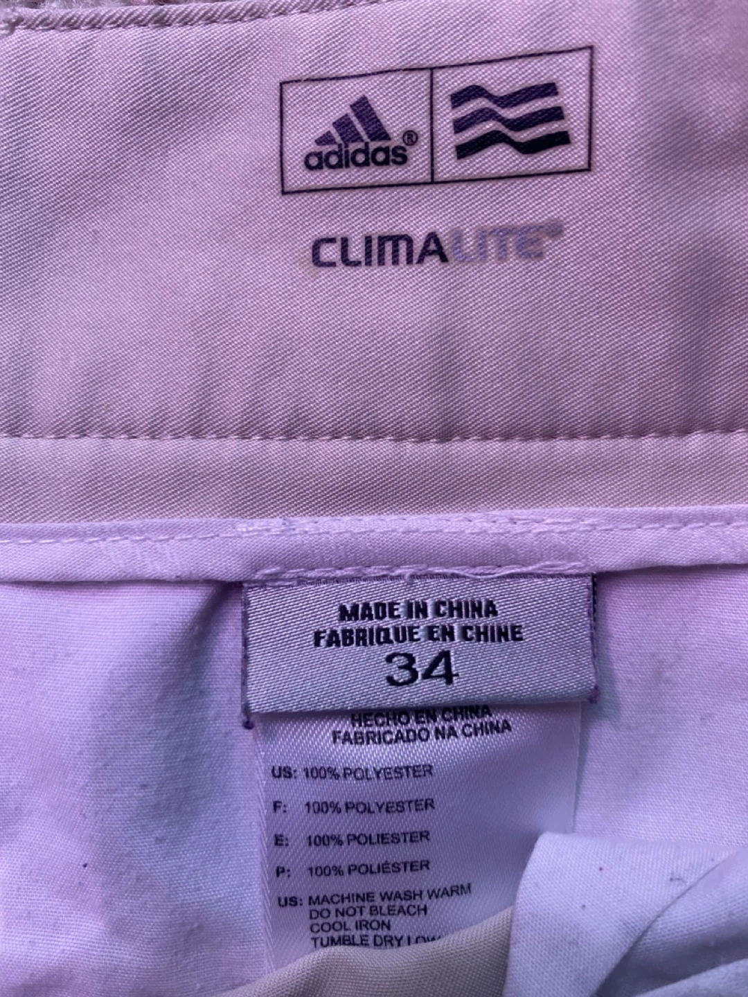 These beige Adidas shorts are made with 100% polyester and feature the Climalite technology. They're a size 34 and perfect for activewear or casual summer days. The material is lightweight and breathable.