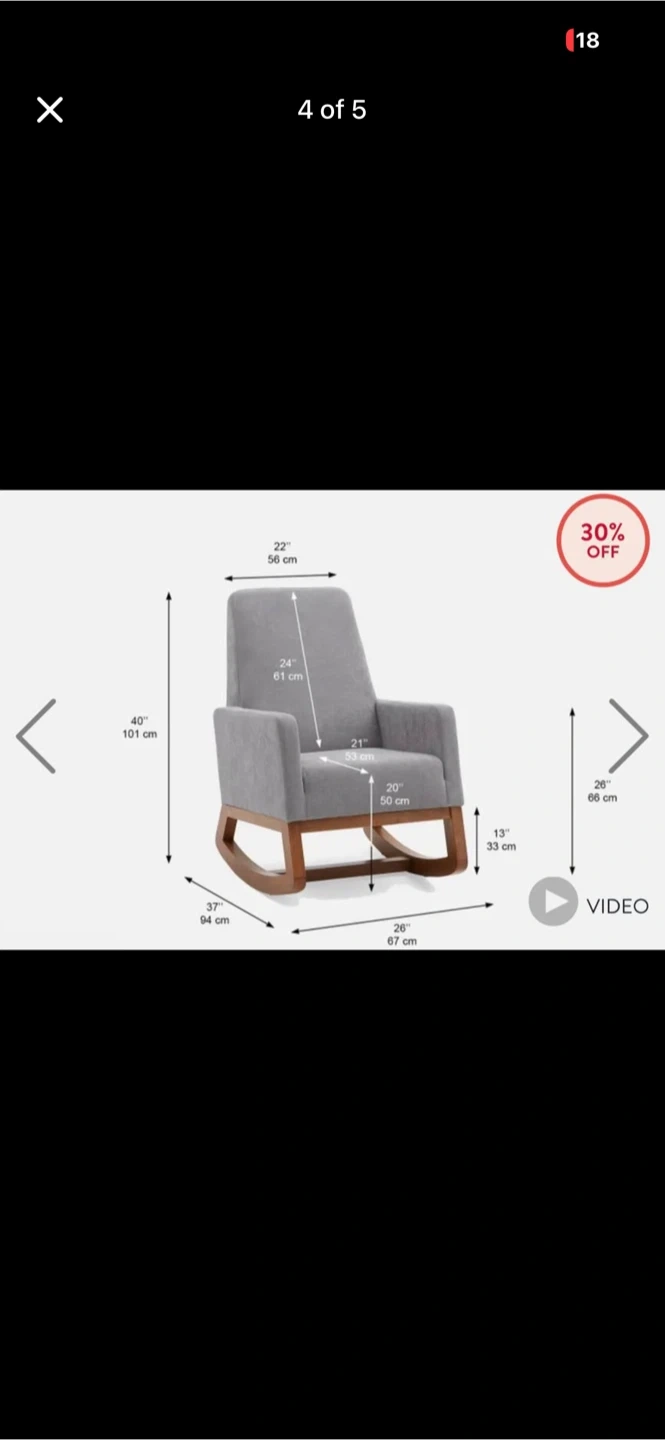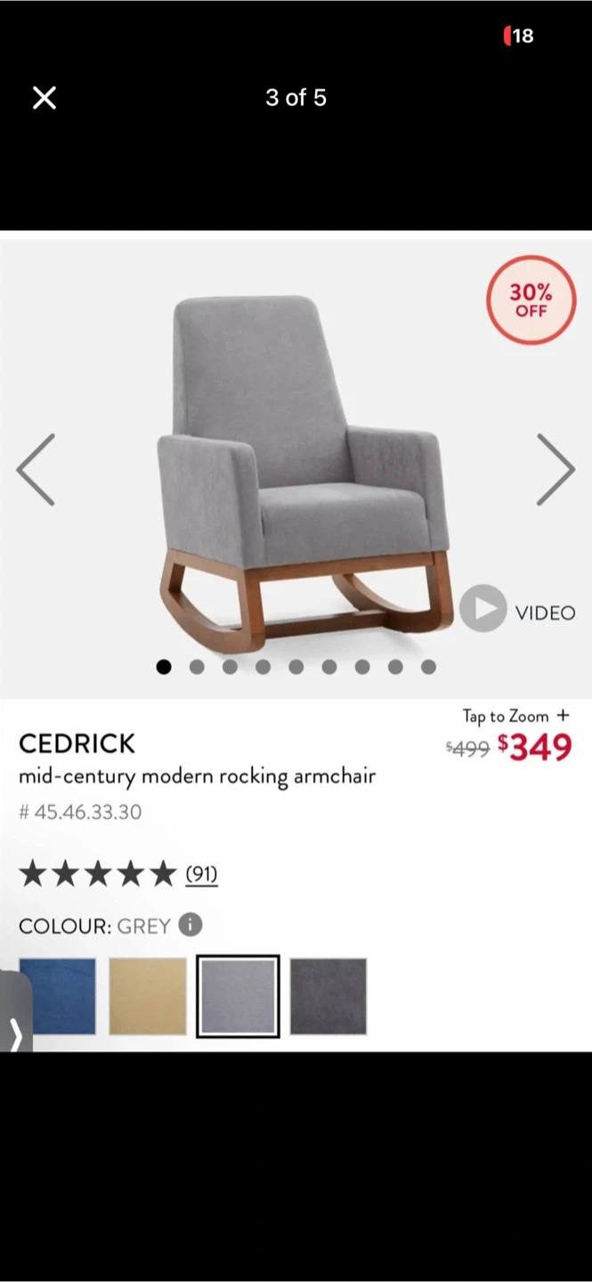 This is a Cedrick mid-century modern rocking armchair in grey. It's upholstered in fabric with a wooden base. Dimensions are 40" H x 26" W x 26" D. Seat depth is 21" and seat height is 20". Arm height is 26" from the floor.
