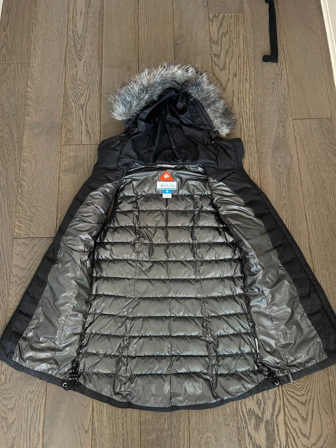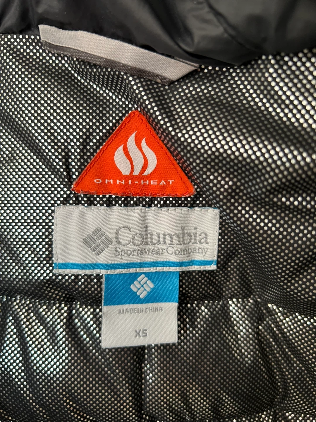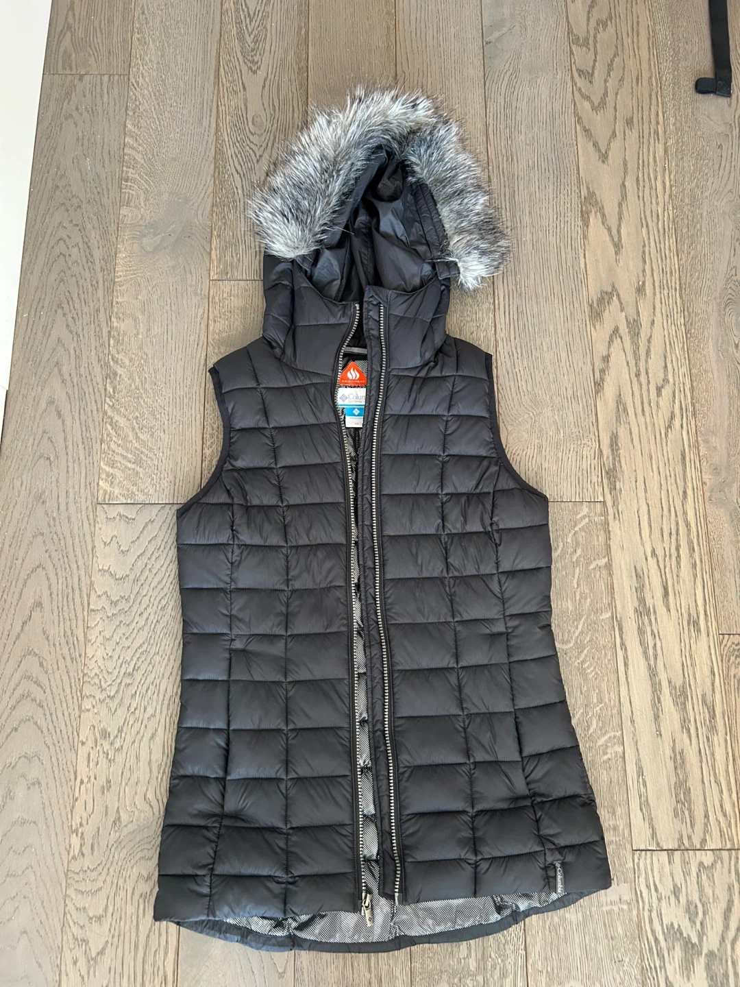 This is a black Columbia vest with a removable hood and faux fur trim. It's insulated with Omni-Heat technology for extra warmth. Size XS.