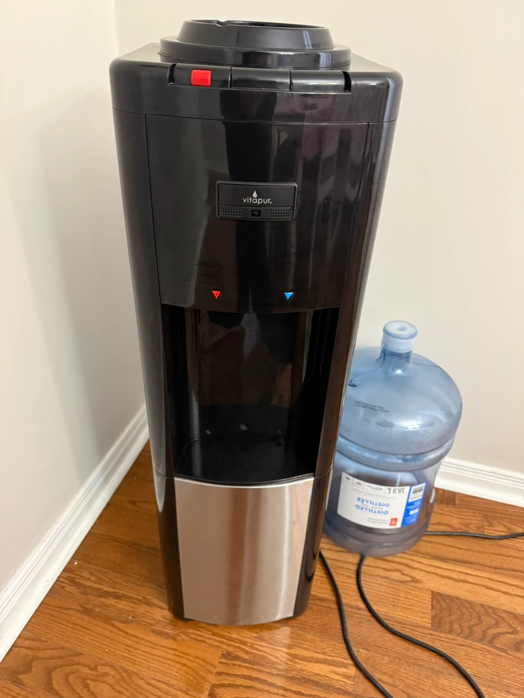 This Vitapur water cooler dispenser provides hot and cold water. It has a black finish and a stainless steel accent. The model number is VWD368BLS.
