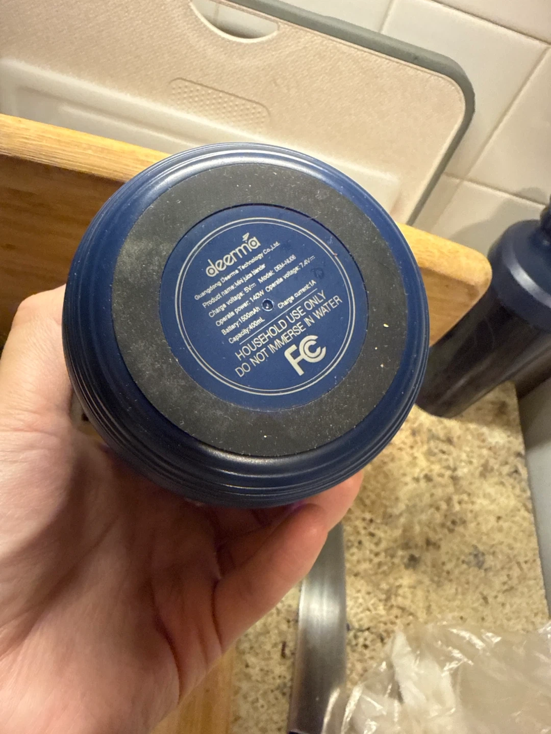 Deerma portable blender, model DEM-JR02. It has a 1500mAh battery capacity and a 400ml capacity. Double click to start! Perfect for making smoothies on the go.