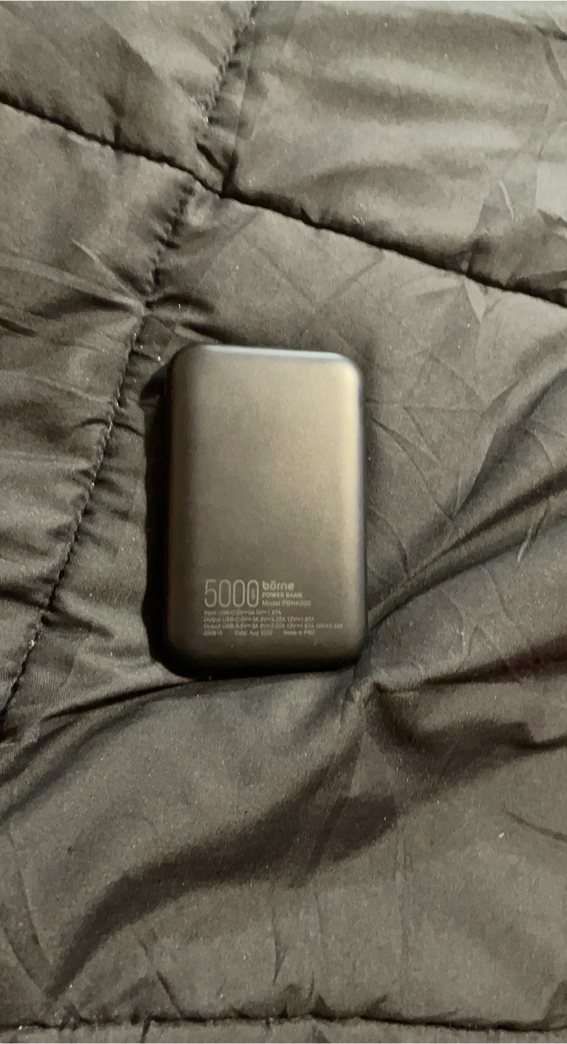 Selling a Borne 5000 Power Bank, model PBNK500. It has both USB-C and USB-A outputs. Date is Aug 2025. comes with usb c charger