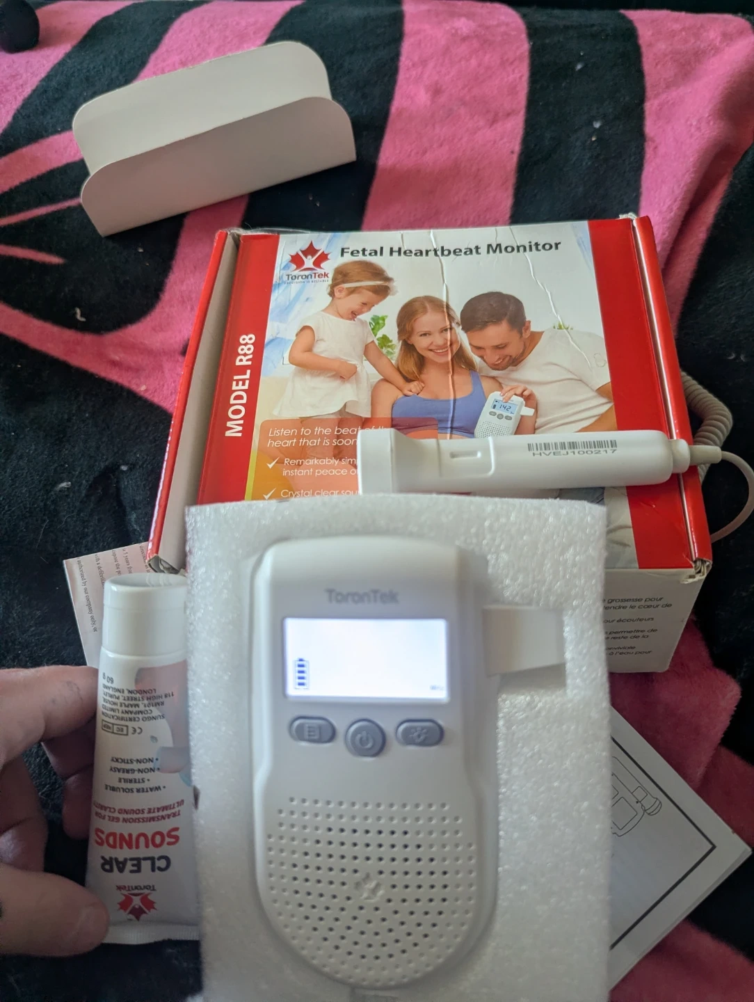 ToronTek fetal heartbeat monitor Model R88. Includes the monitor, probe, and transmission gel. Crystal clear sound. Remarkably simple to use for instant peace of mind.