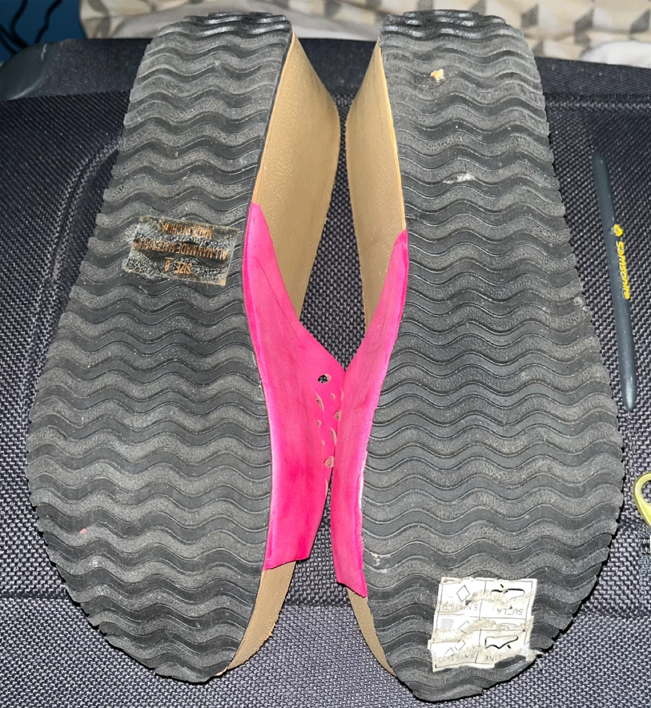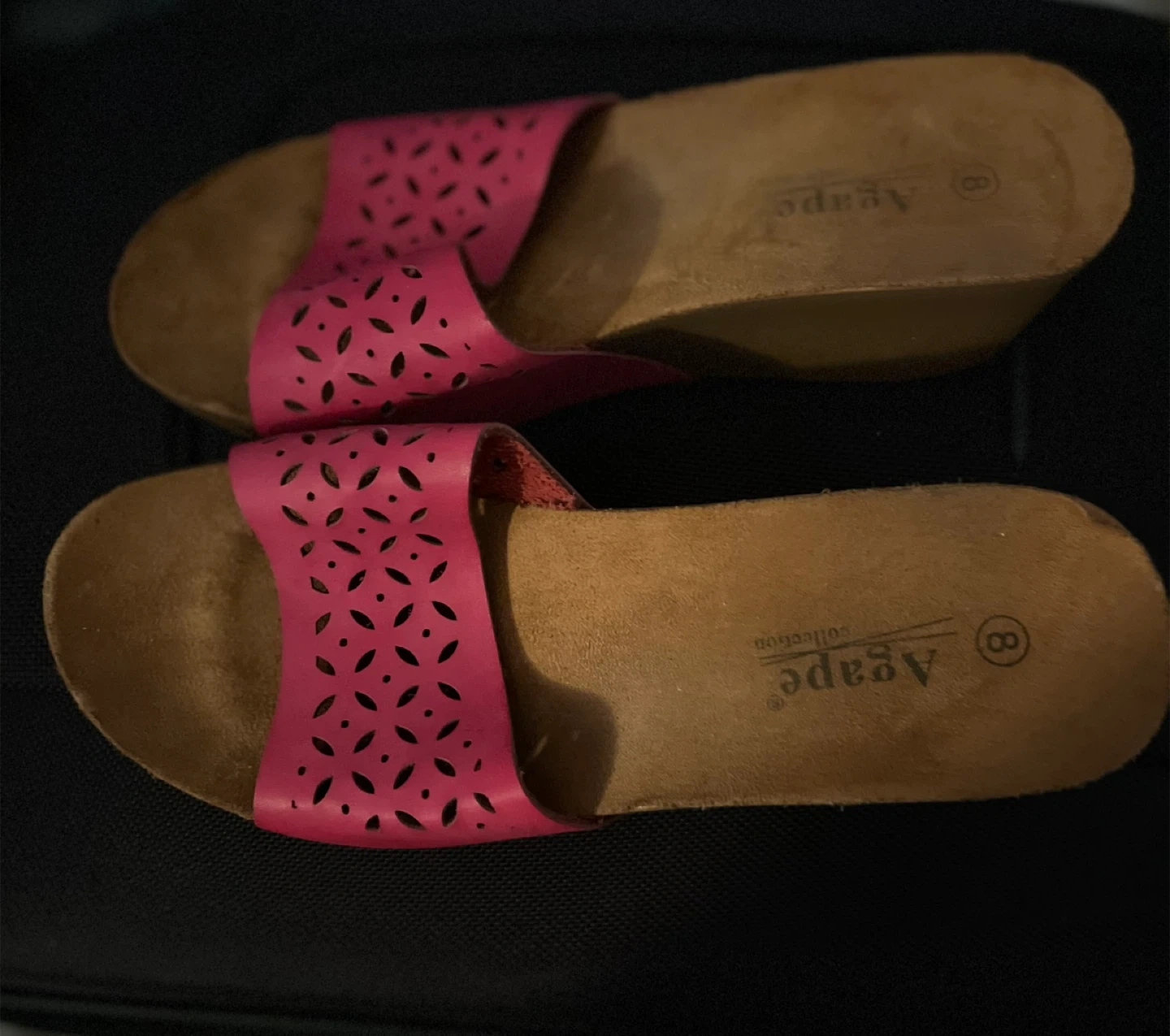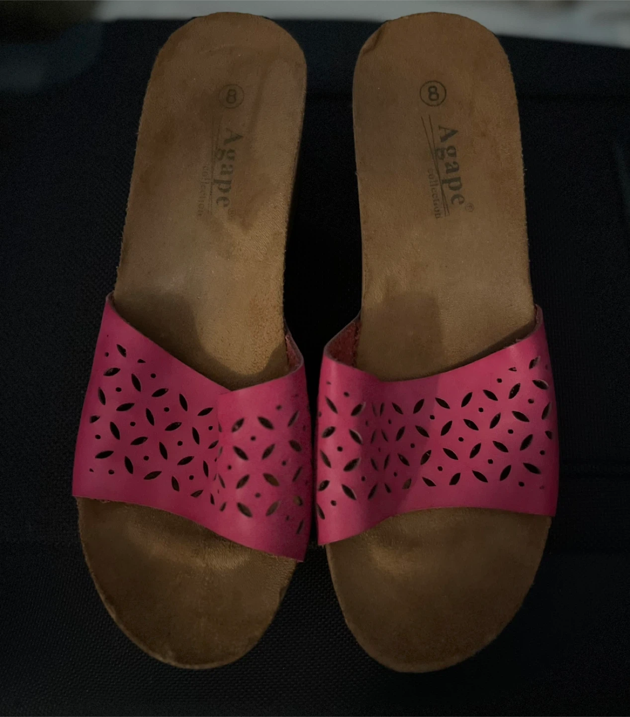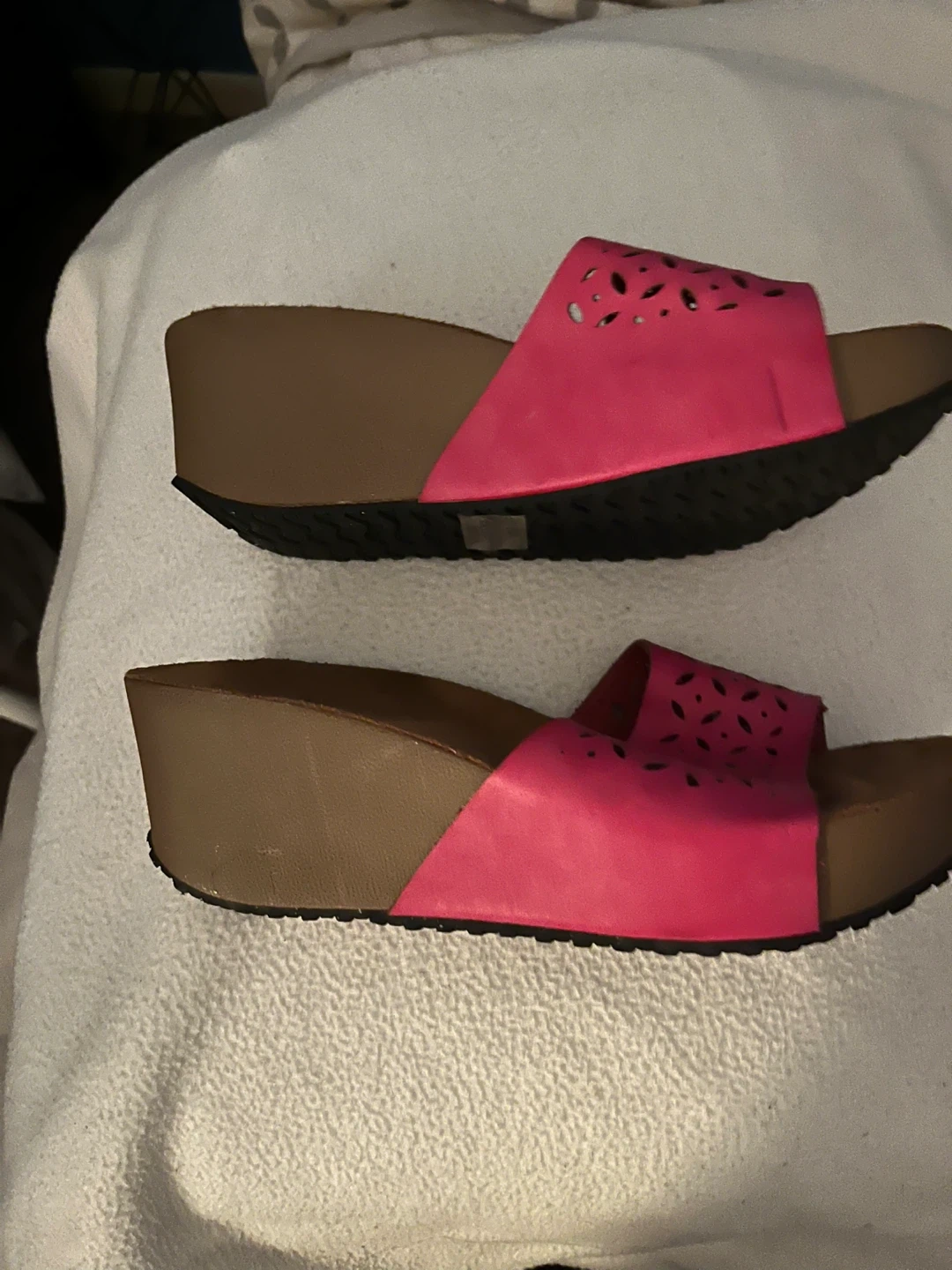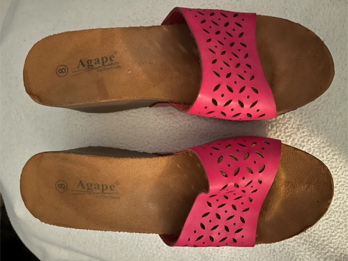These Agape Collection slides are a vibrant pink with a cool laser-cut design across the strap. They're size 8 with a comfortable cork-like footbed. Perfect for warm weather! These are great for casual wear.
