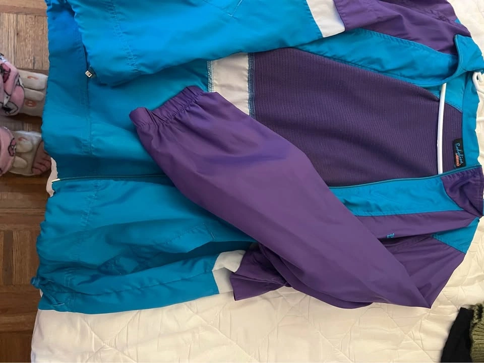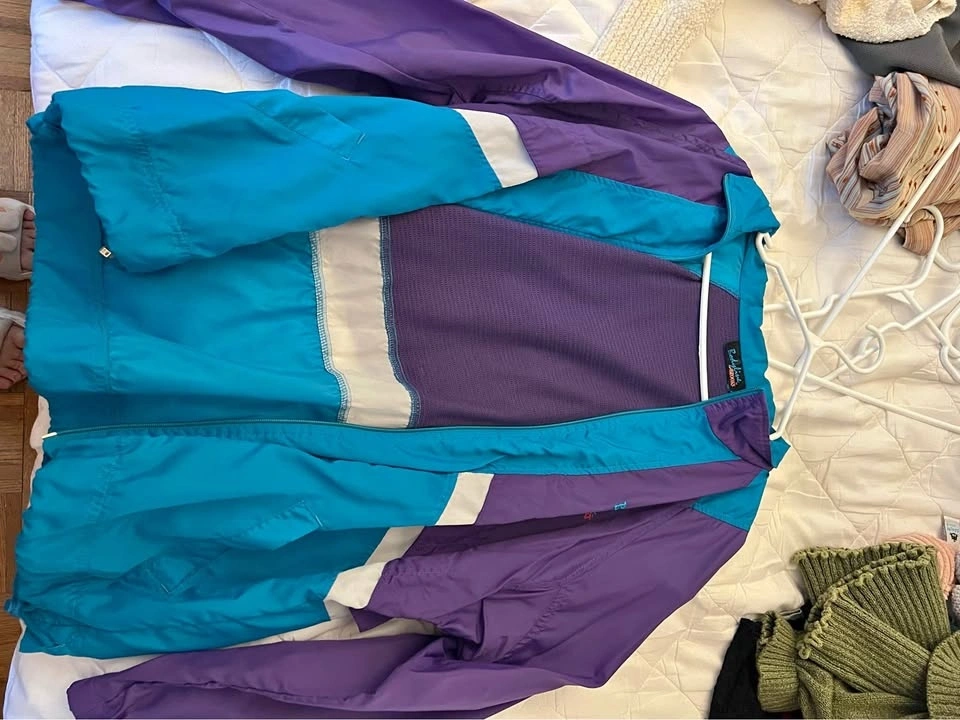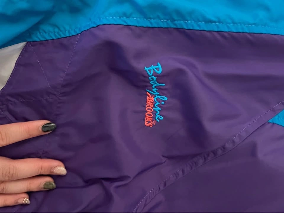 Very loved vintage windbreaker from bodyline by brooks. Lightweight and size large. Has adjustment strings on bottom, pockets, and zipper works well.