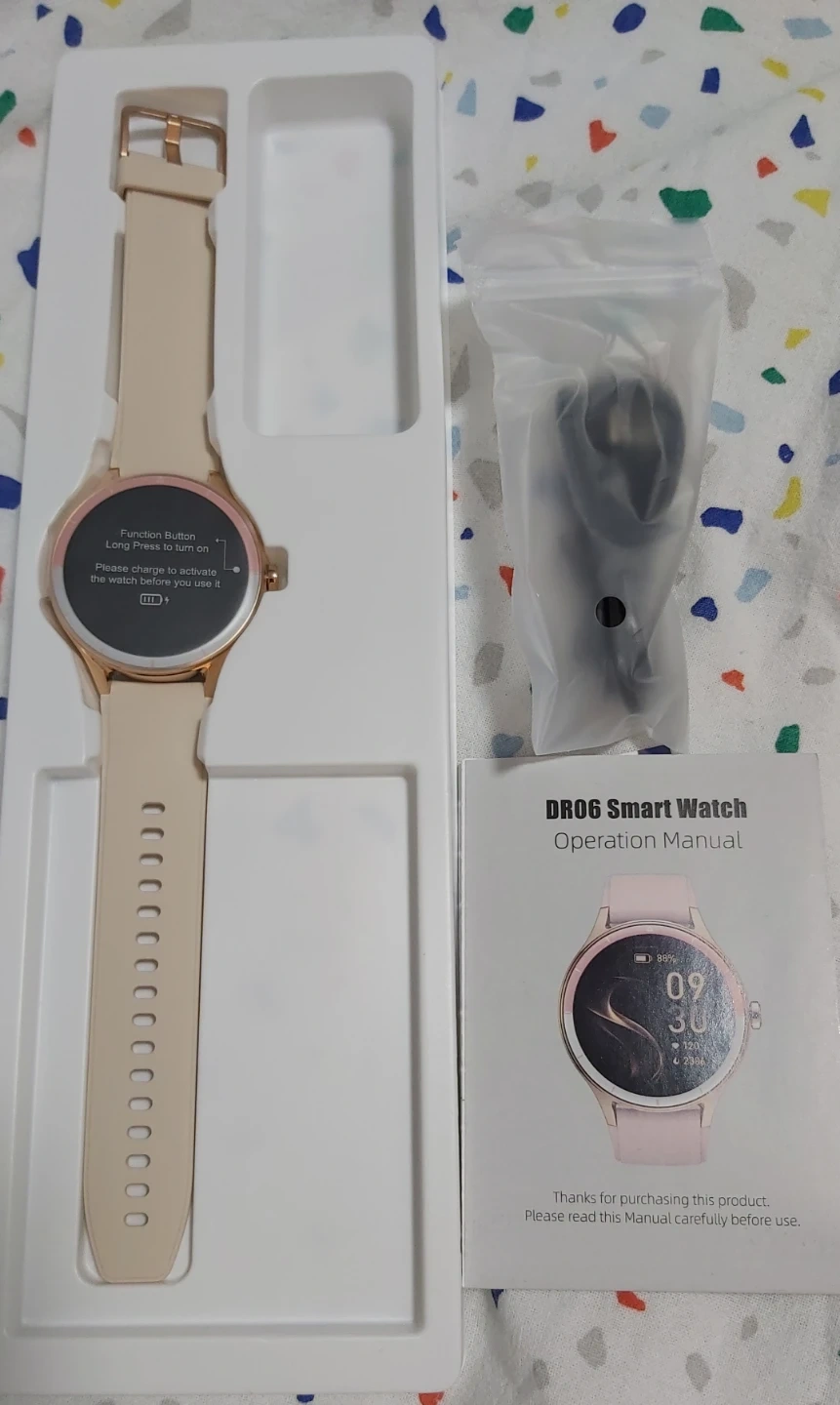 Smart Watch for Women, iPhone & Android Compatible - Smart Watch with a rose gold casing and pink band. Includes charging cable and operation manual. Please charge to activate the watch before you use it.