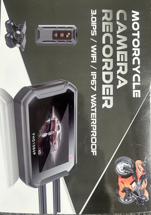Brand new motorcycle dual camera recorder DVR with front and back cameras. Features a 3.0-inch IPS screen, Wi-Fi, and is IP67 waterproof. Supports Full HD 1080P recording. Includes loop recording and automatic collision locking. Only 2 in stock.