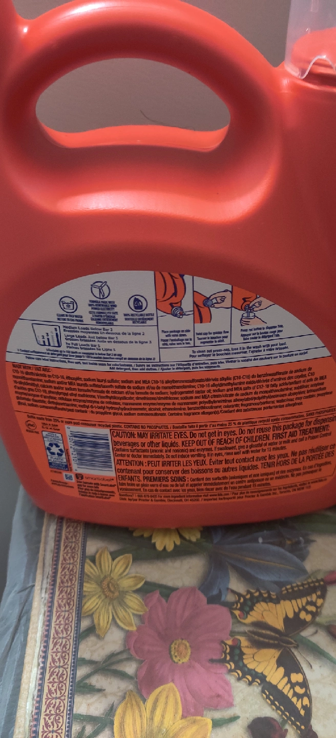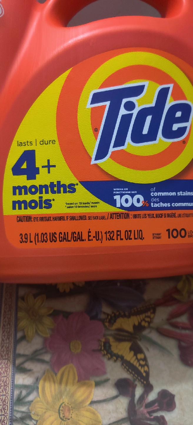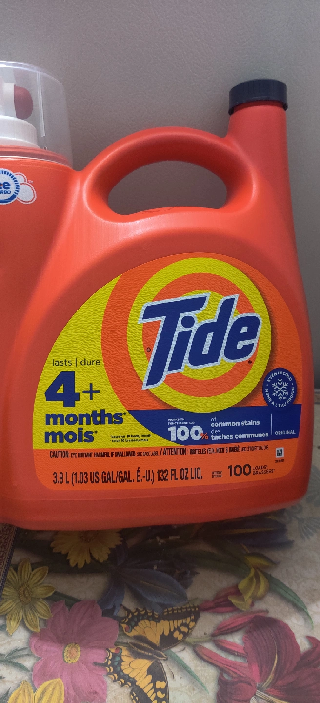 I'm selling a large container of Tide laundry detergent. It's the original formula and lasts for 4+ months. The container holds 3.9L (1.03 US GAL/GAL. É.-U.) 132 FL OZ LIQ. It tackles 100% of common stains