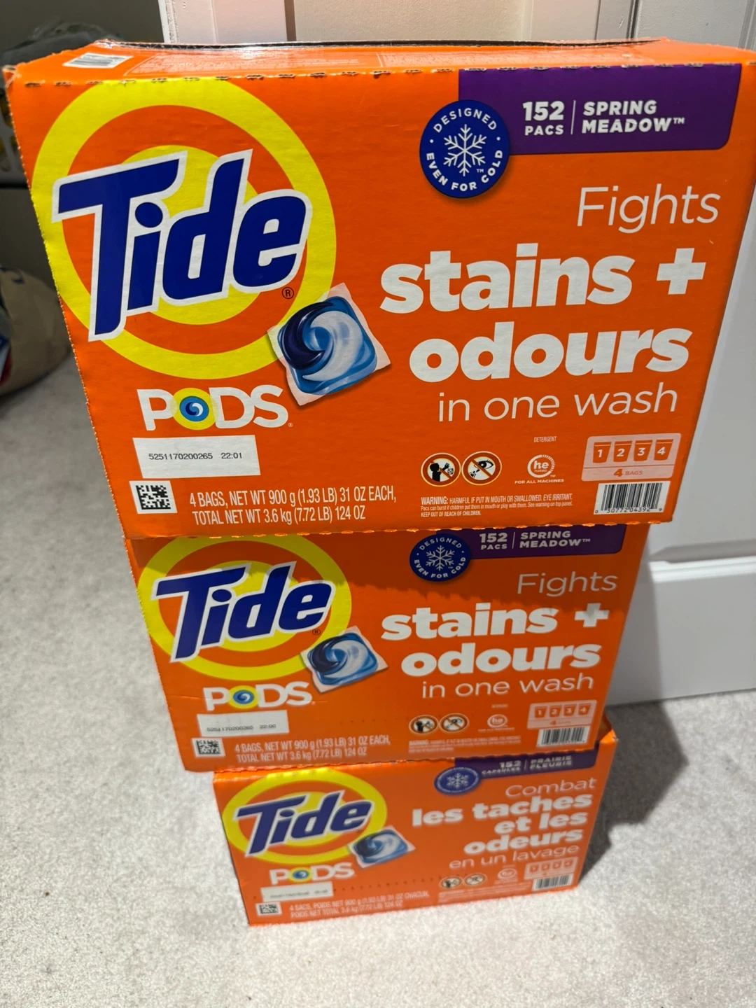 Get your laundry done with these Tide PODS! Each box contains 152 pacs in the Spring Meadow scent. They fight stains and odours in one wash and are designed to work even in cold water. Each box contains 4 bags, with a total net weight of 3.6 kg (7.72 lb)