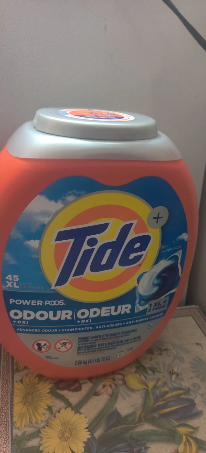 1000+Selling a container of Tide Power Pods Odour + Oxi, with 45 XL capsules. These are great for advanced odour and stain fighting! The container also has a child lock for safety.