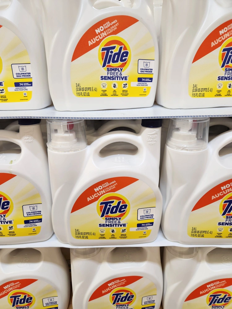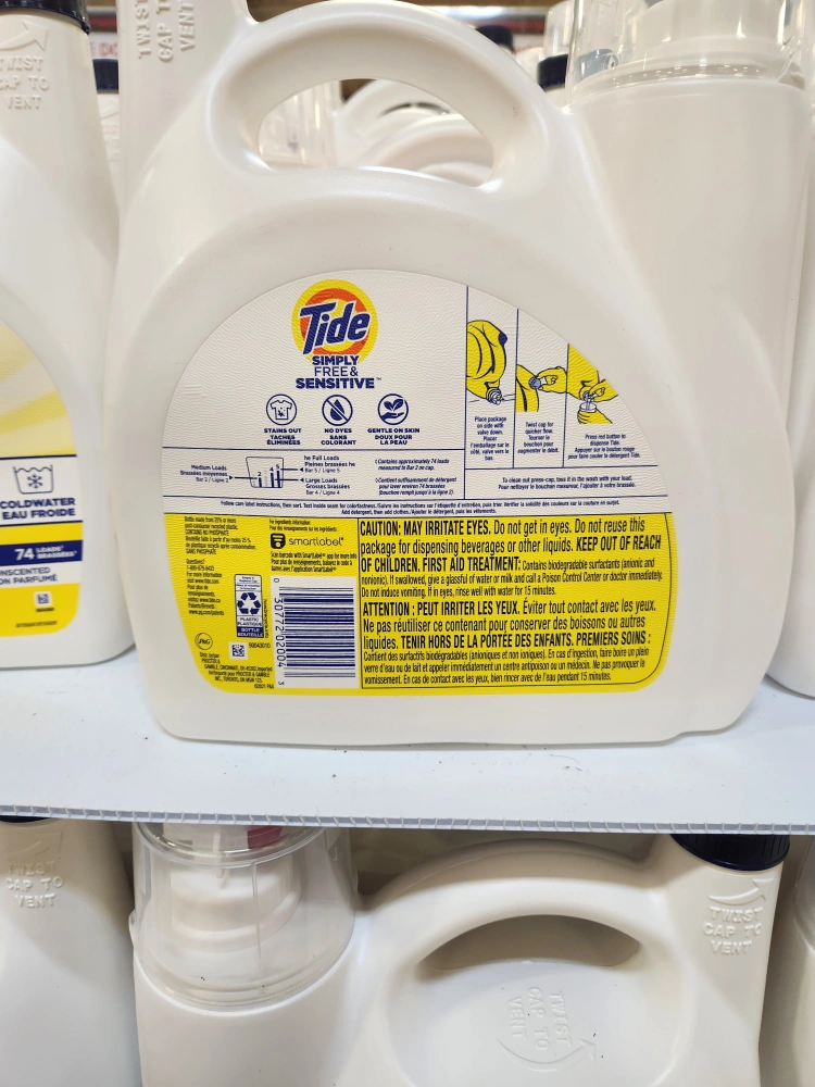 I'm selling a large 3.4L bottle of Tide Simply Free & Sensitive laundry detergent. It's perfect for sensitive skin and has no dyes or perfumes. Great for the whole family!