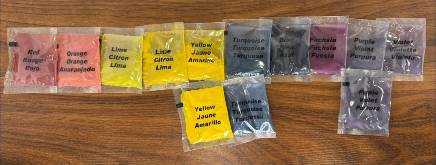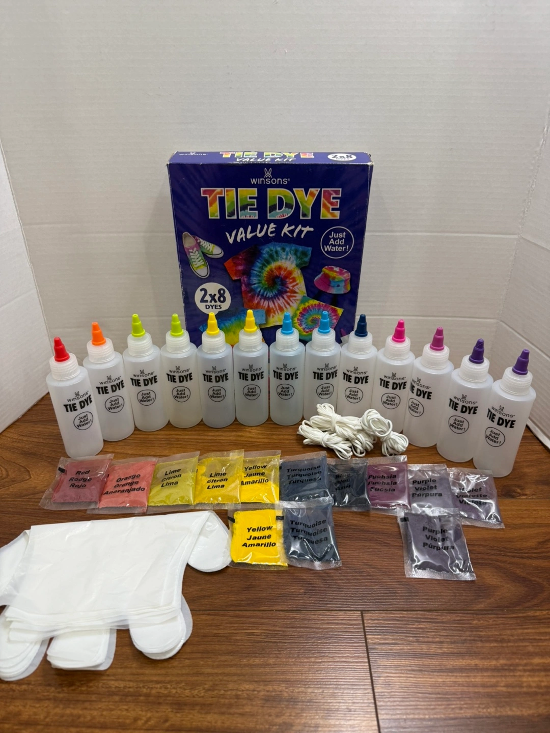 Includes dyes in a variety of colours: Red, Orange, Lime, Yellow, Turquoise, Blue, Fuchsia, and Purple. Also included are squeeze bottles, rubber bands, and gloves. There are a few extra bottles and dyes from a separate box I had used.