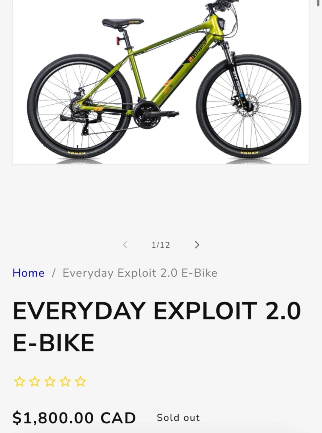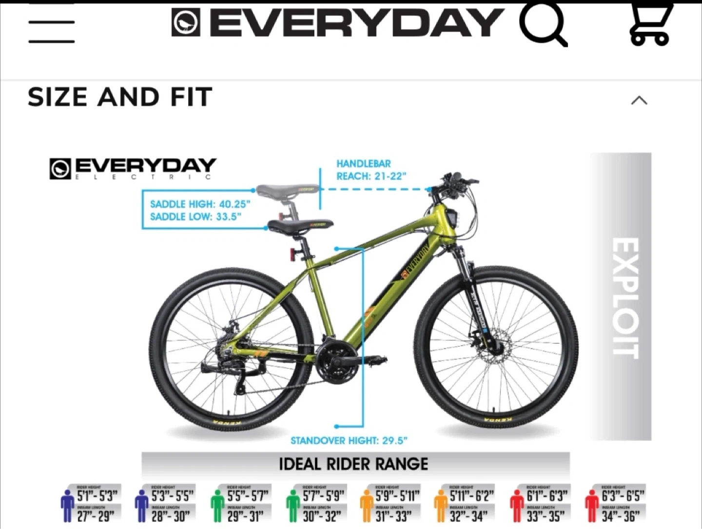 EVERYDAY Exploit 2.0 E-Bike in green. Size chart available for rider heights 5'1" to 6'3". Saddle height adjustable from 33.5" to 40.25". Great for commuting or trails!