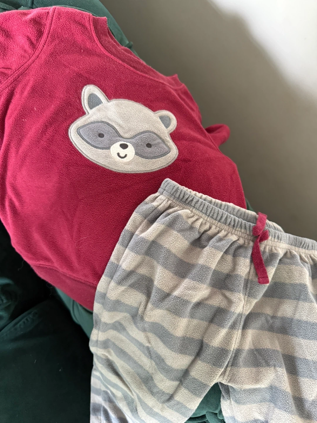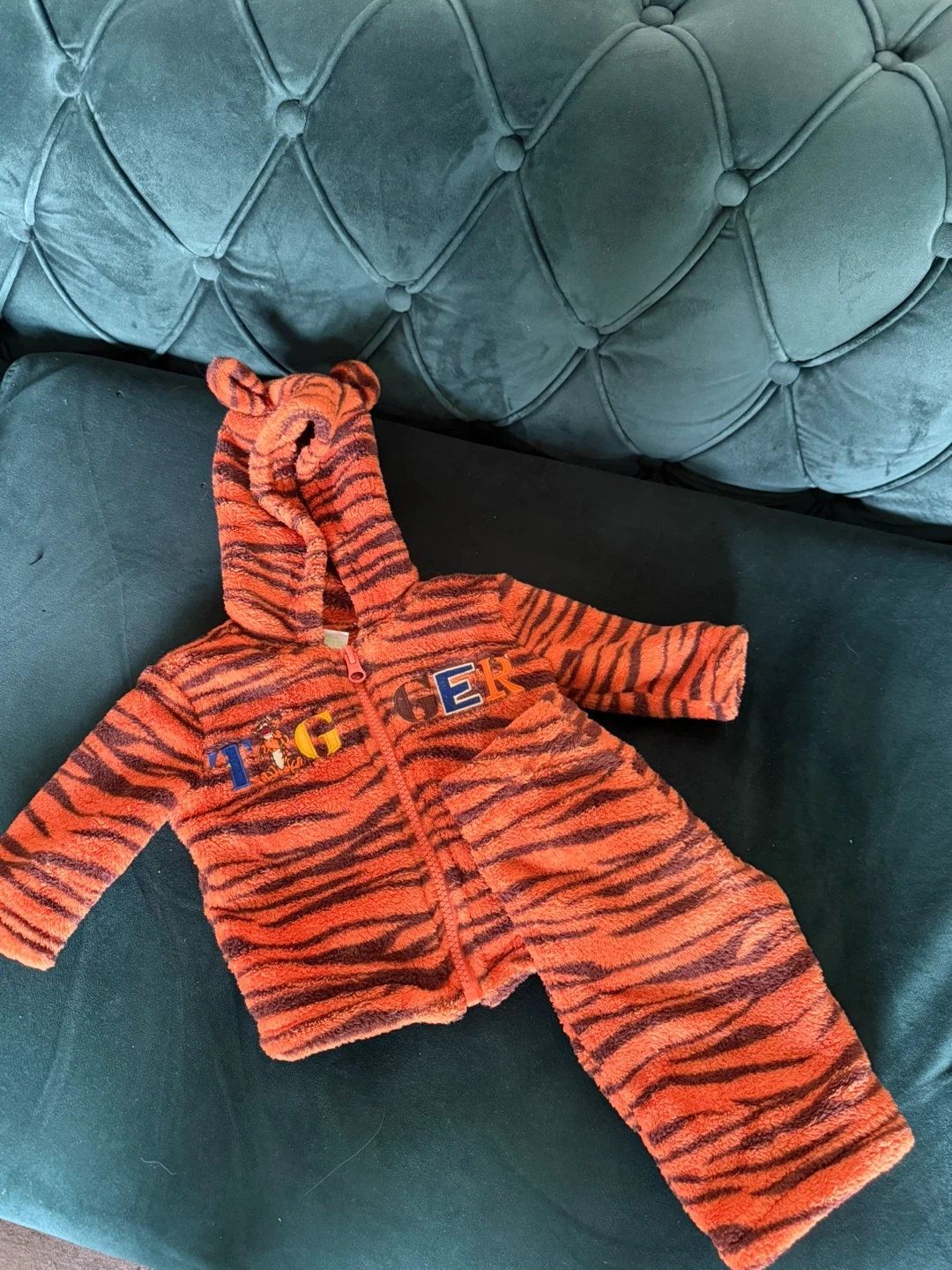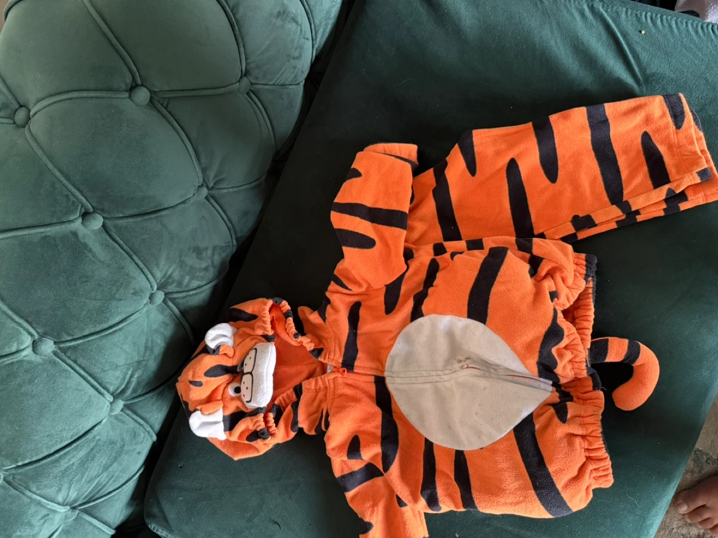I'm selling a cute tiger costume and a set of raccoon pajamas! The tiger costume is orange with black stripes and has a hood with ears. The raccoon pajamas are a red top with a raccoon face and striped grey and white bottoms. Perfect for your little one for the fall weather and Halloween . Tiger - 0-3 months - $10 Tiger costume with cushioned tummy - 24 months -$10 Raccoon costume - 24 months -$10