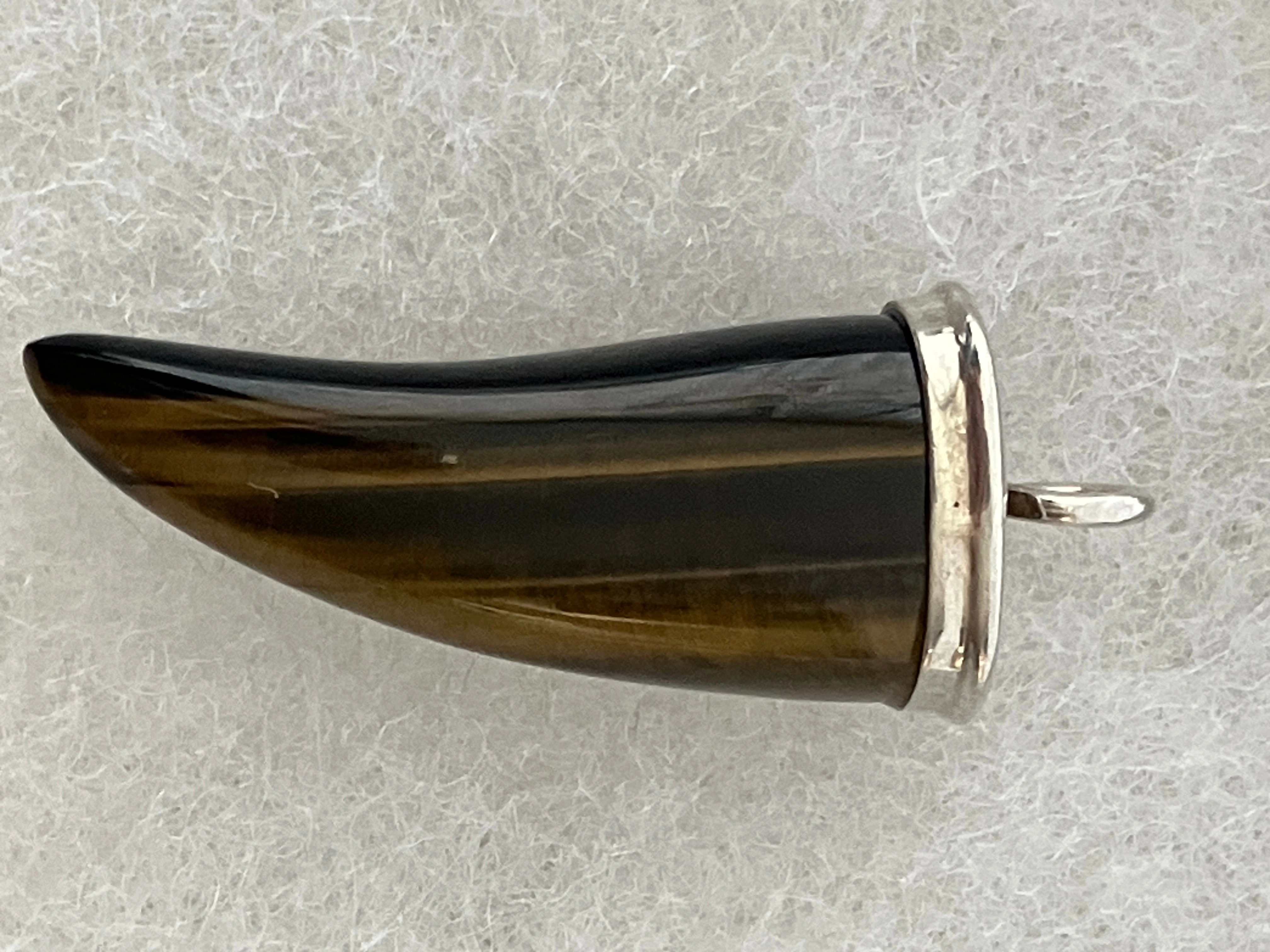18Here's a cool tiger eye pendant! It's got a sterling silver top and loop for attaching to a necklace or chain. The horn itself is about 1 inch long. It's in great shape and ready for a new home!