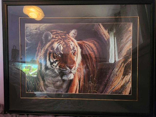 10This is a used tiger picture, perfect for adding a touch of the wild to your home decor. This striking piece features a majestic tiger in its natural habitat, bringing a sense of strength and serenity to any room. Displaying some wear, this picture has a unique charm and character, making it a great addition to any art collection. Picture Details: * Subject: Tiger * Frame: Black with gold trim * Condition: Used Looking to add a touch of the jungle to your living room? Maybe your office needs some roaring inspiration? If the ad is up, it's still available.