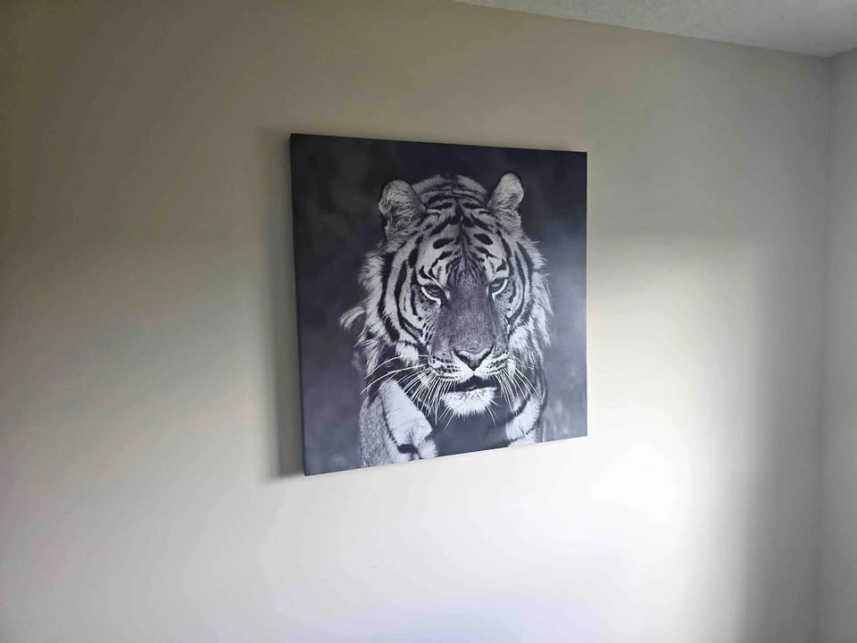 Elevate your space with this captivating 36x36-inch black and white tiger canvas print. This striking piece is in excellent condition, ready to bring a touch of the wild into your home or office. The canvas is stretched perfectly, offering a sleek and modern look that will complement any decor. Feel free to message if you have any questions!
