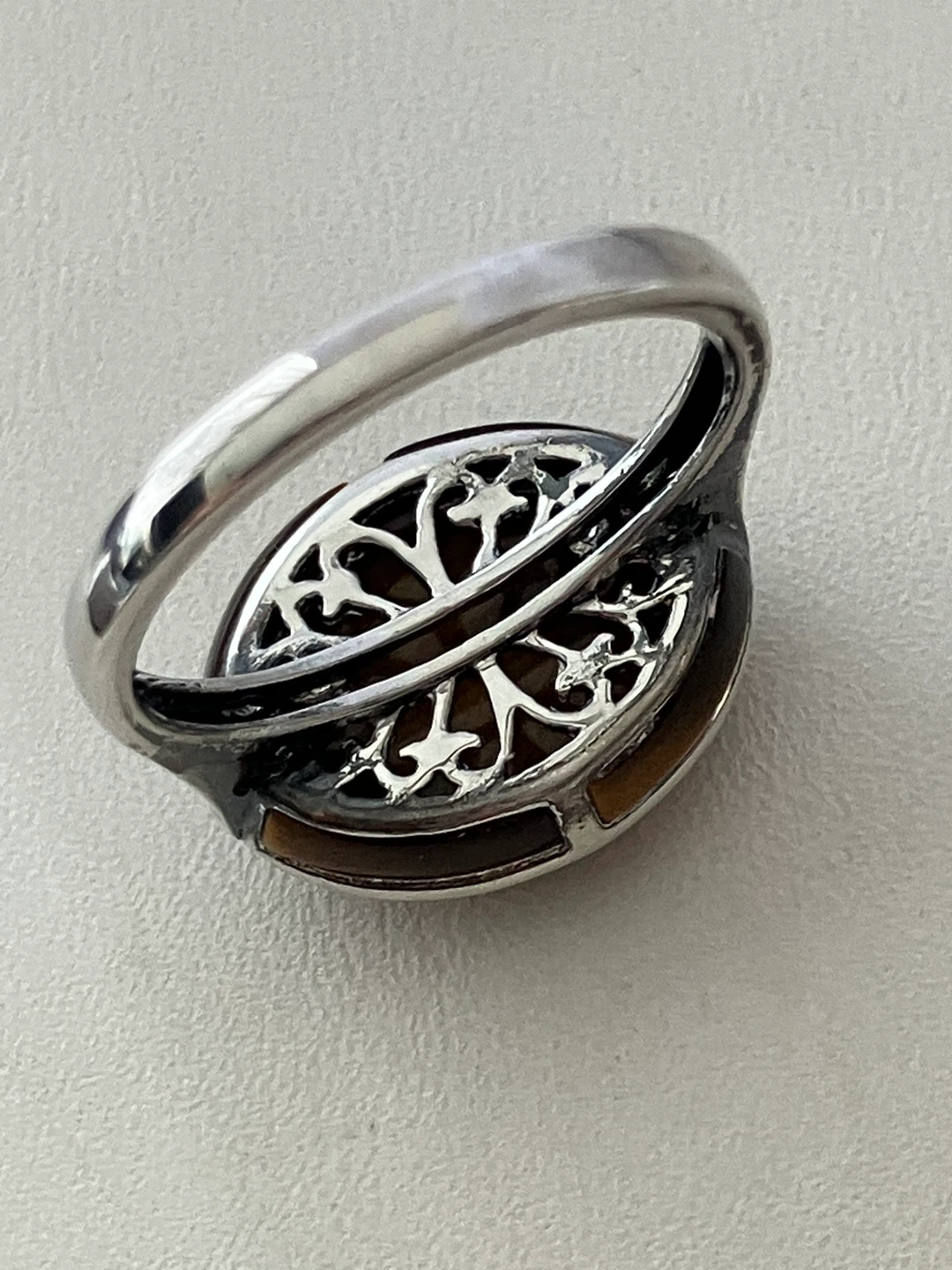 18Beautiful tiger's eye ring set in sterling silver (marked 925). The stone is surrounded by real diamonds, adding a touch of sparkle. It's in great condition and ready to wear