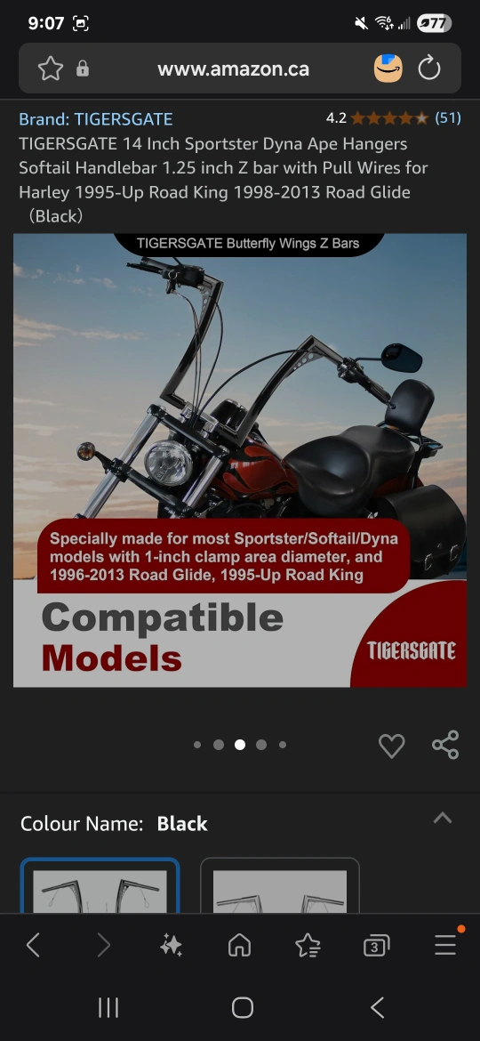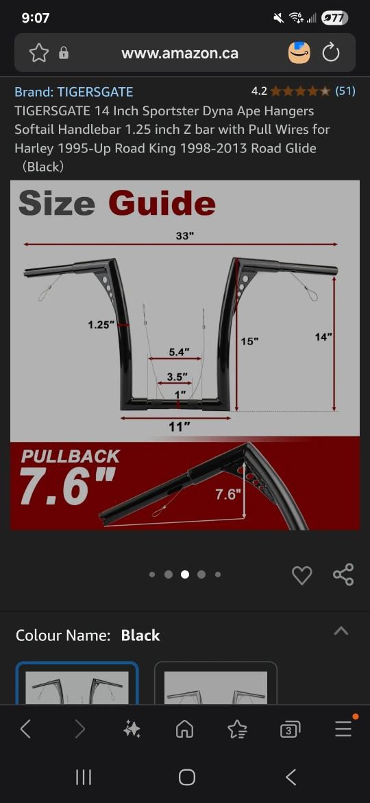 60Selling a TIGERSGATE 14 inch Sportster Dyna Ape Hangers handlebar. It features a 1.25 inch Z bar with pull wires, suitable for Harley 1995-Up Road King 1998-2013 Road Glide models. Colour is black.