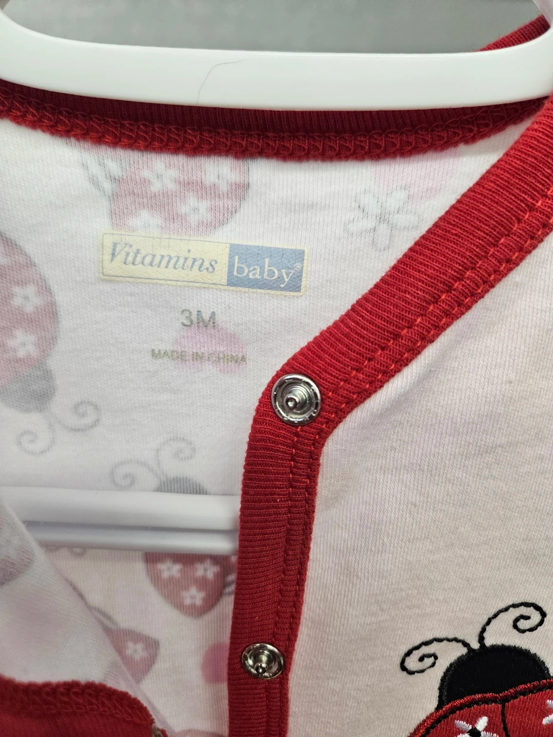 This is a pink baby sleepsuit from Vitamins Baby. It's size 3 months and features a cute ladybug and heart pattern. It's made from soft fabric for your little one's comfort. Perfect for keeping your baby cozy at night!