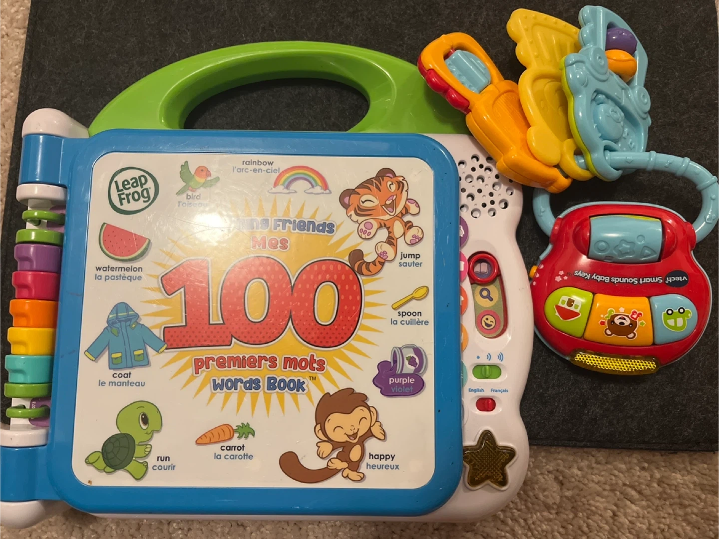 This interactive toy set includes a LeapFrog learning book with colourful pages and a VTech Smart Sounds Baby Keys toy. Both are designed for little ones to explore words, animals, and more. Batteries may be required for full functionality. It's a great way for babies to learn and play!