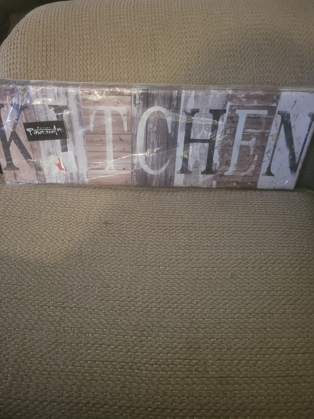 This Pinetree Art sign features the word "Kitchen" with a rustic wood-look design. It's a nice accent for any home kitchen space. The sign is in new condition, still in its original packaging.