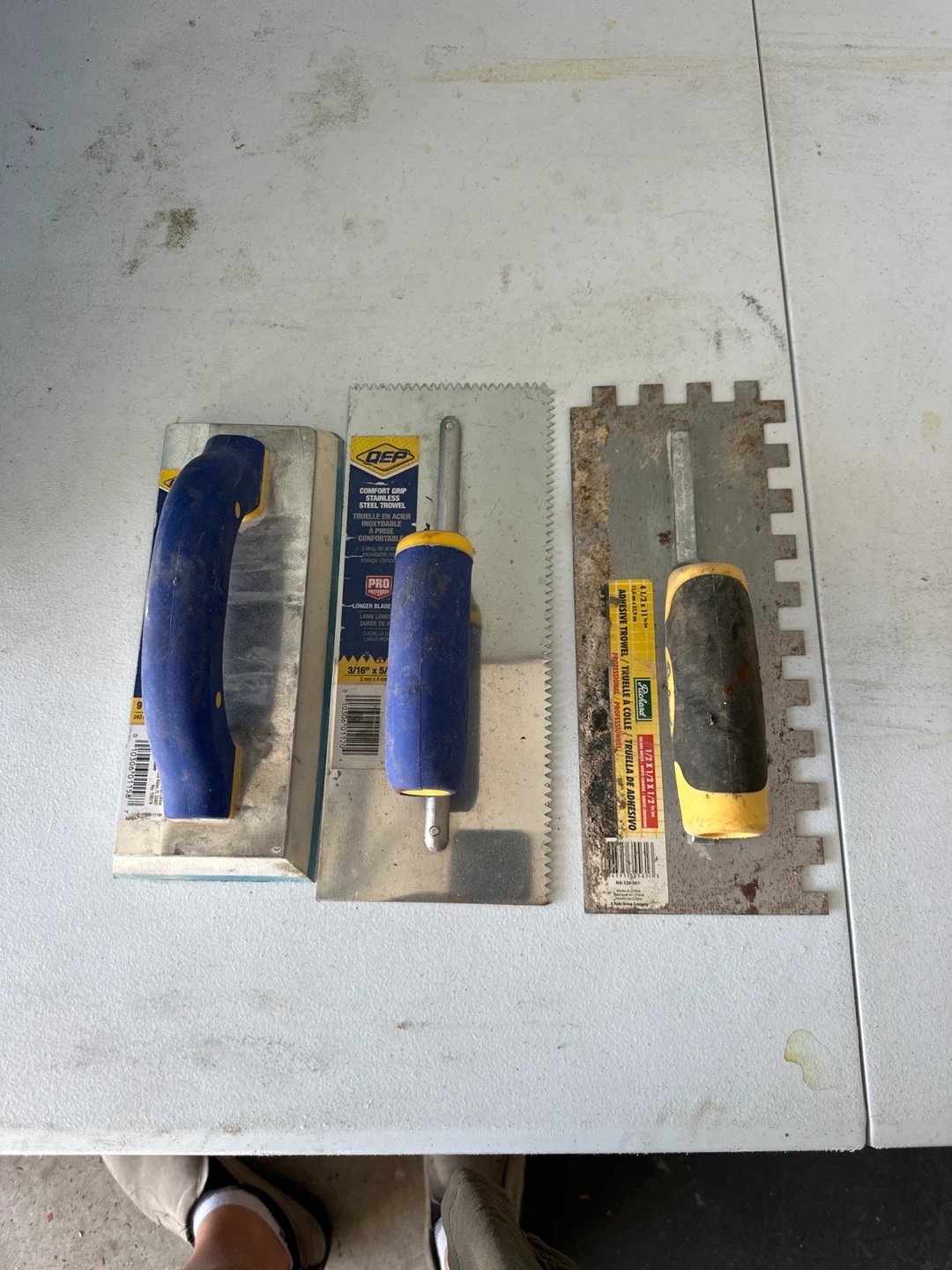 Selling a set of tile trowels, including brands QEP and Richard. One is a QEP comfort grip stainless steel trowel with a 3/16" x 5/32" notch size. Another is a Richard adhesive trowel and a grout float