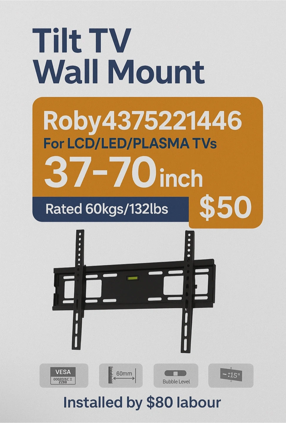 85Looking to sell this Tilt TV Wall Mount! It's designed for LCD, LED, and Plasma TVs ranging from 37 to 70 inches. It can hold up to 60kgs or 132lbs. Original selling for $50 installation $80 depending upon your location!