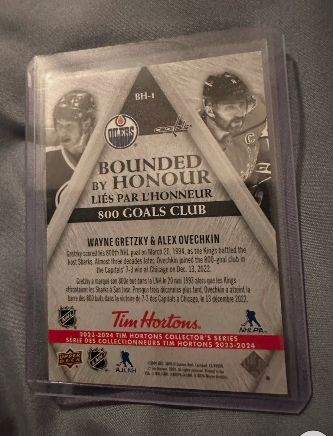 Selling a set of Tim Hortons 2023-2024 Collector's Series hockey cards. Includes cards featuring Connor McDavid and Wayne Gretzky from the Oilers, and Wayne Gretzky & Alex Ovechkin Bounded by Honour card. Great for any hockey fan or collector! they are selling for more by others as noted in the other two pictures