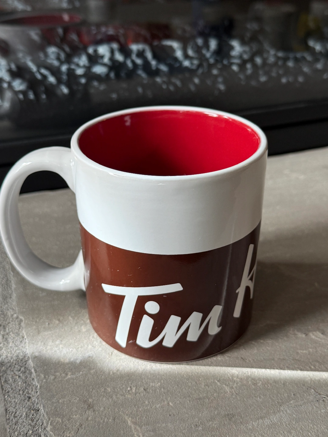 Tim Hortons coffee mug in brown and white with a red interior! It is dishwasher and microwave safe. The mug is made in China.