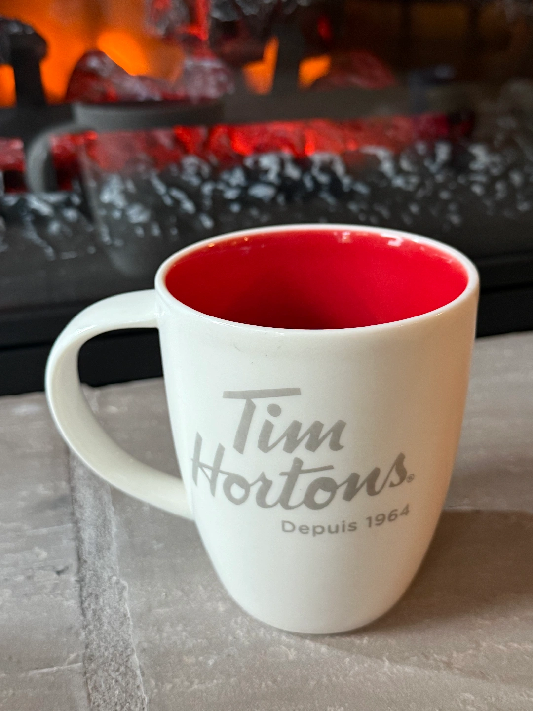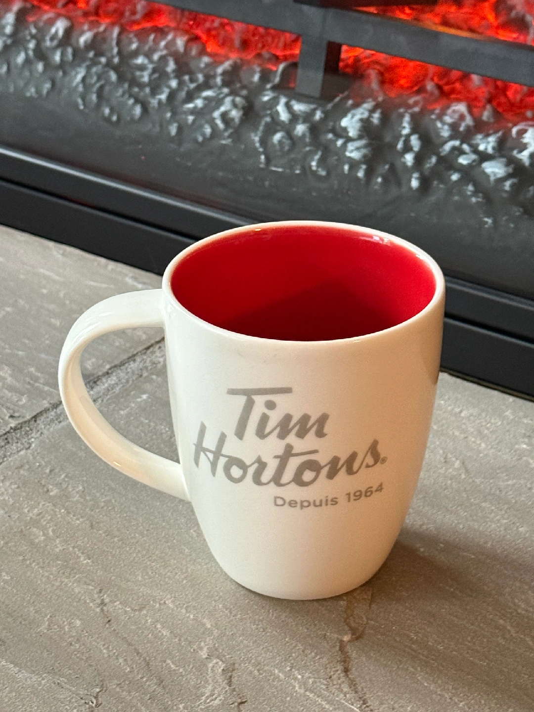 Selling a Tim Hortons ceramic mug! It's a limited edition, dishwasher and microwave safe. The mug is white on the outside with a red interior and features the Tim Hortons logo.