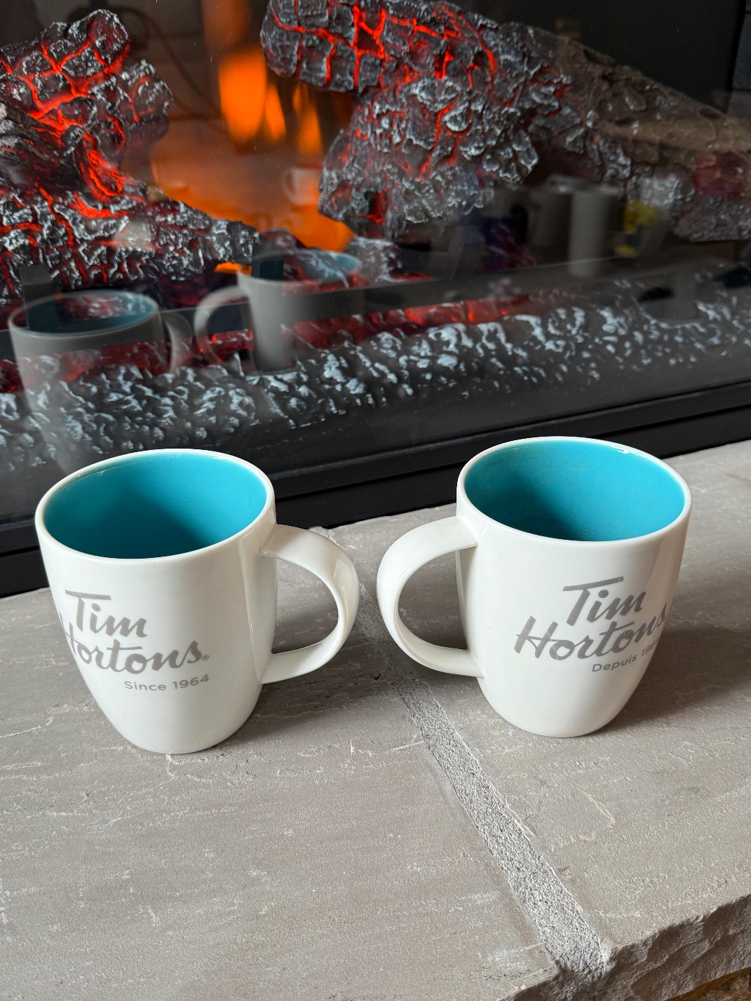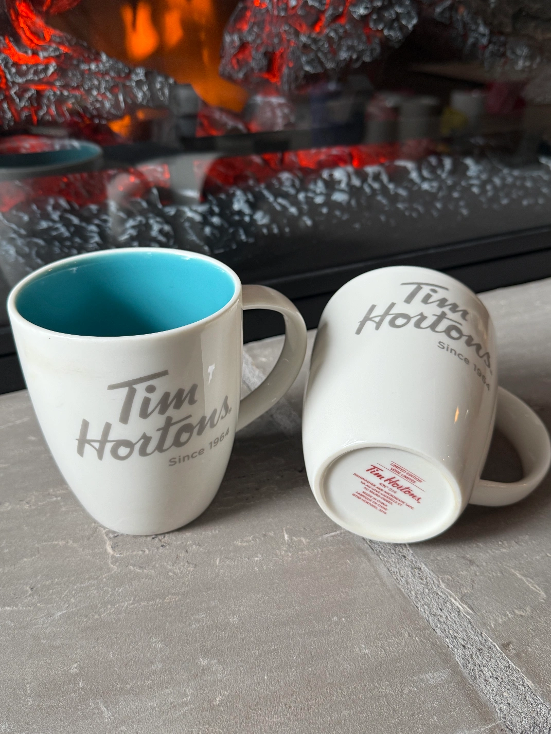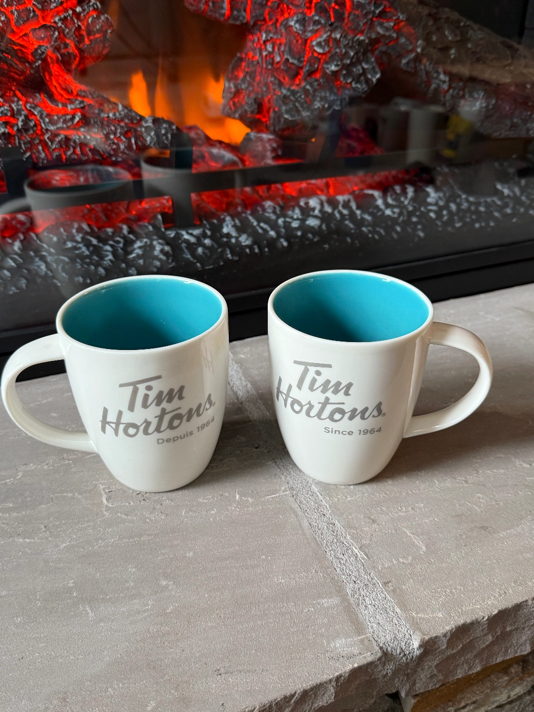 Selling a set of two Tim Hortons mugs! They're in great condition and feature the classic Tim Hortons logo. The inside of the mugs are a nice light blue colour. Perfect for your morning coffee or tea!