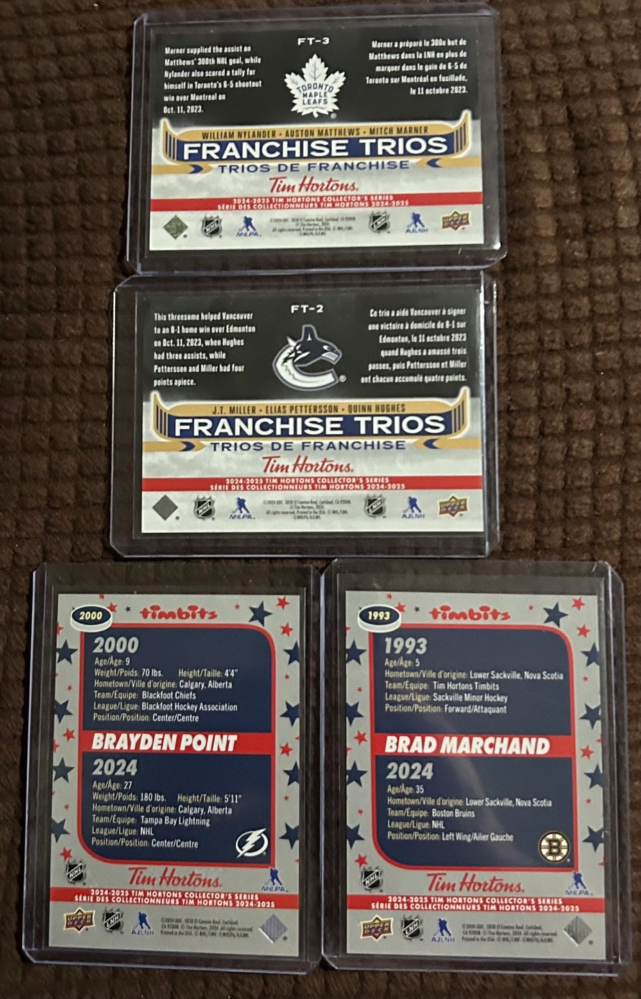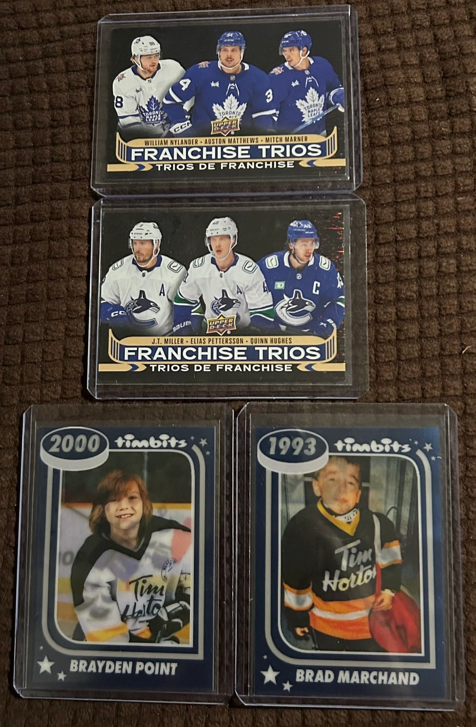 23Four hockey cards, featuring franchise trios of Toronto Maple Leafs and Vancouver Canucks, and individual cards for Brayden Point and Brad Marchand.