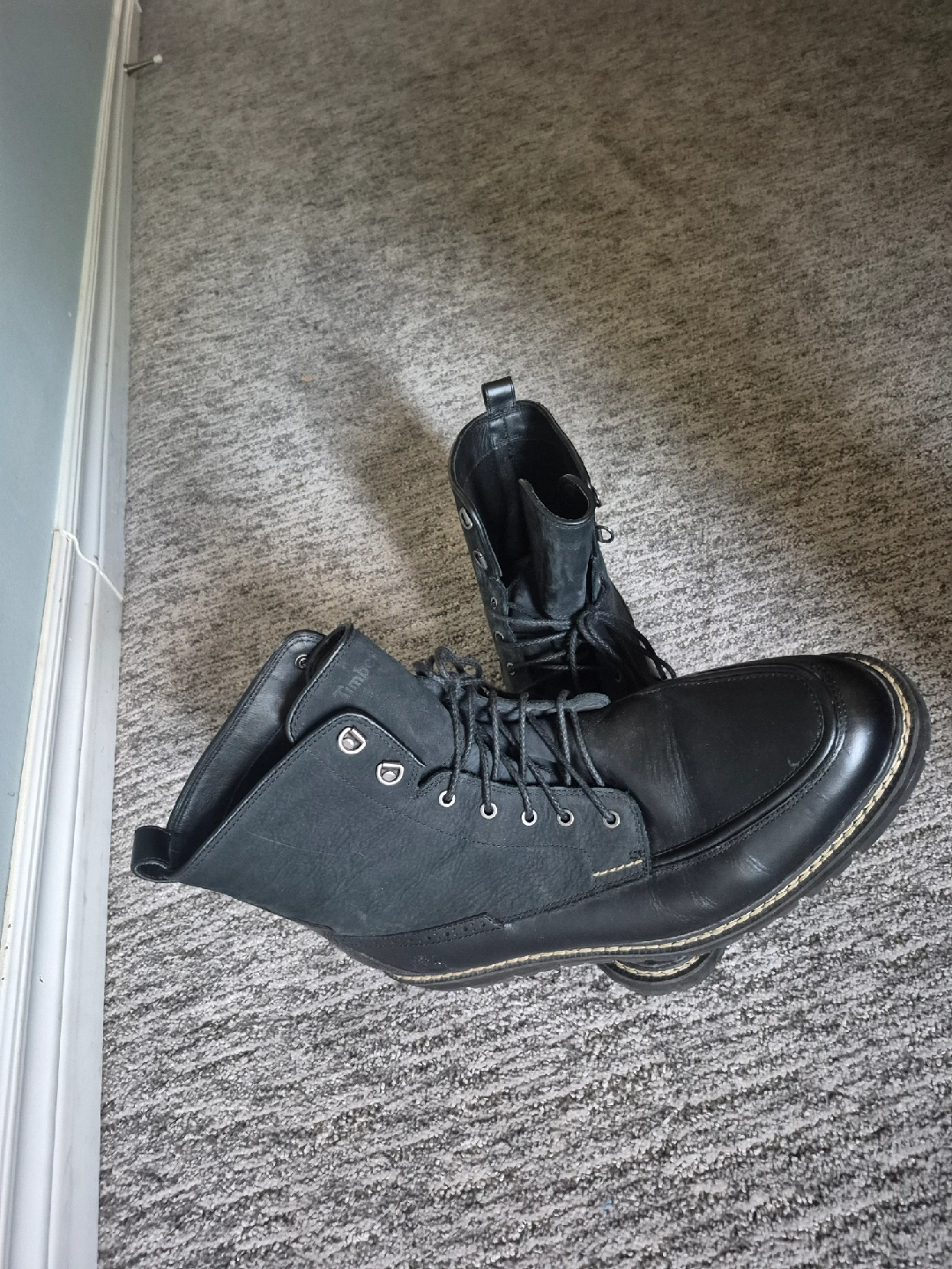 Selling a pair of Timberland ankle boots in black leather. They are in great condition with some signs of wear. These boots are a size 10 and ready for a new home!