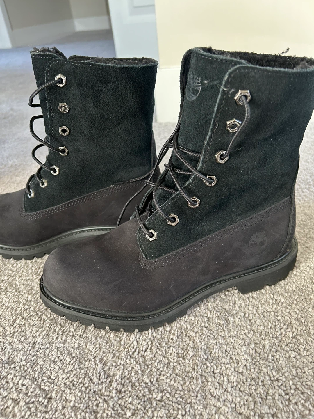 Selling a pair of Timberland boots in black suede. They are in perfect condition and ready for a new home! I also have them in wheat in a 7 and a classic timberland boot, size 6