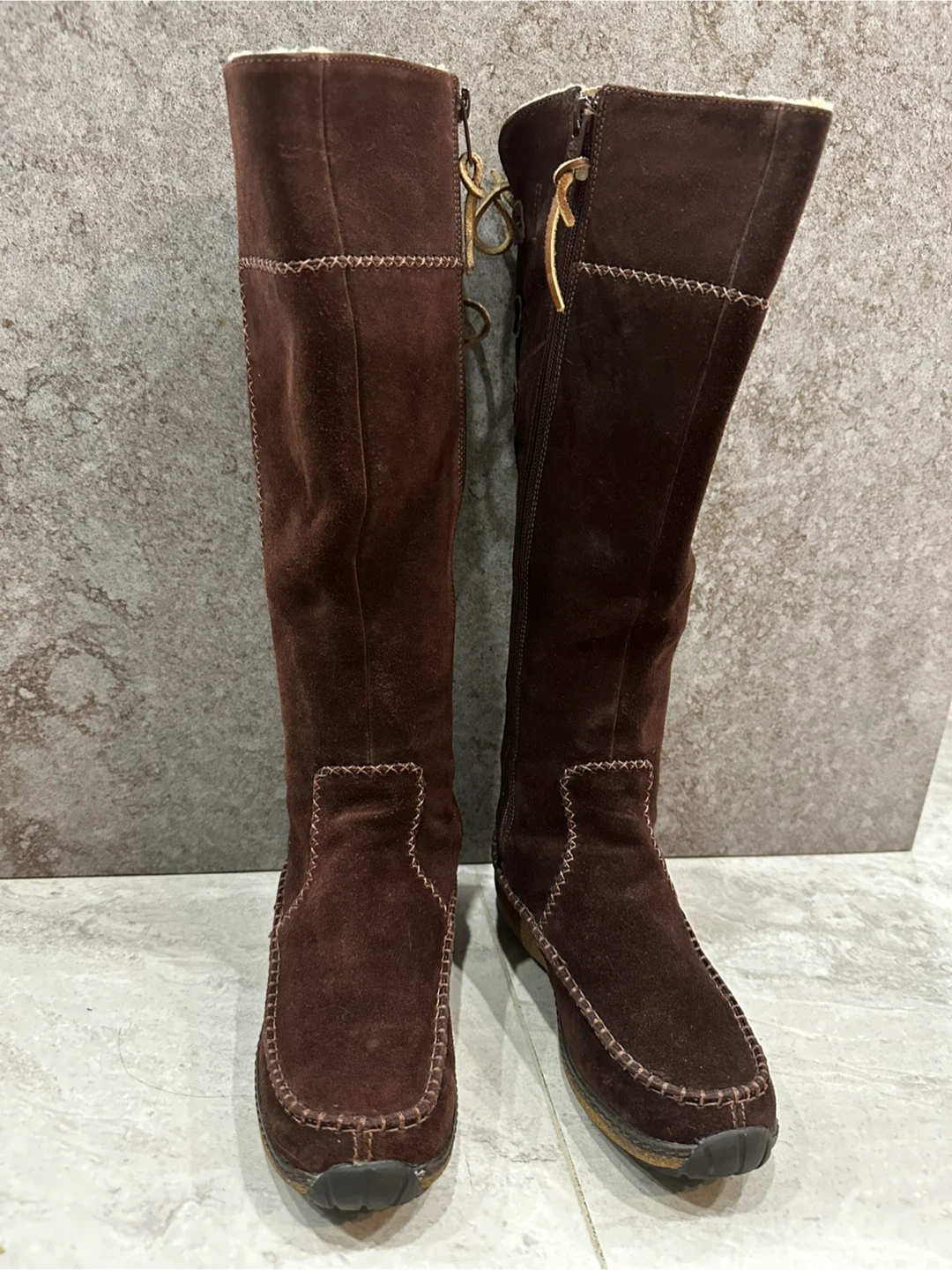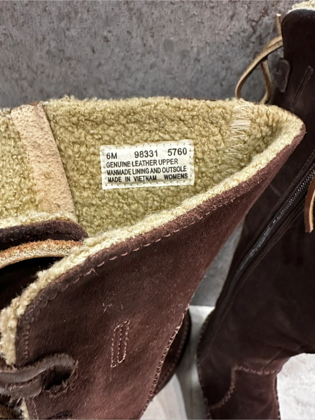 28Selling a pair of Timberland boots in a lovely brown suede! They're a women's size 6. The boots have a genuine leather upper and a man-made lining and outsole. Perfect for keeping your feet warm and stylish during the colder months!