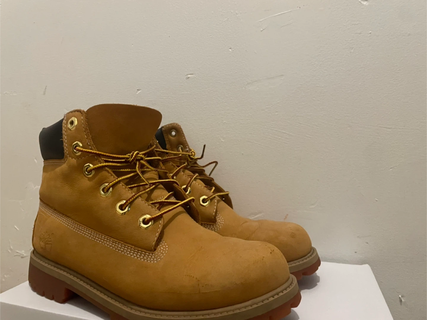 Selling a pair of Timberland classic yellow boots. They're in good condition with some signs of wear. Perfect for everyday use or outdoor adventures! Size is not indicated.
